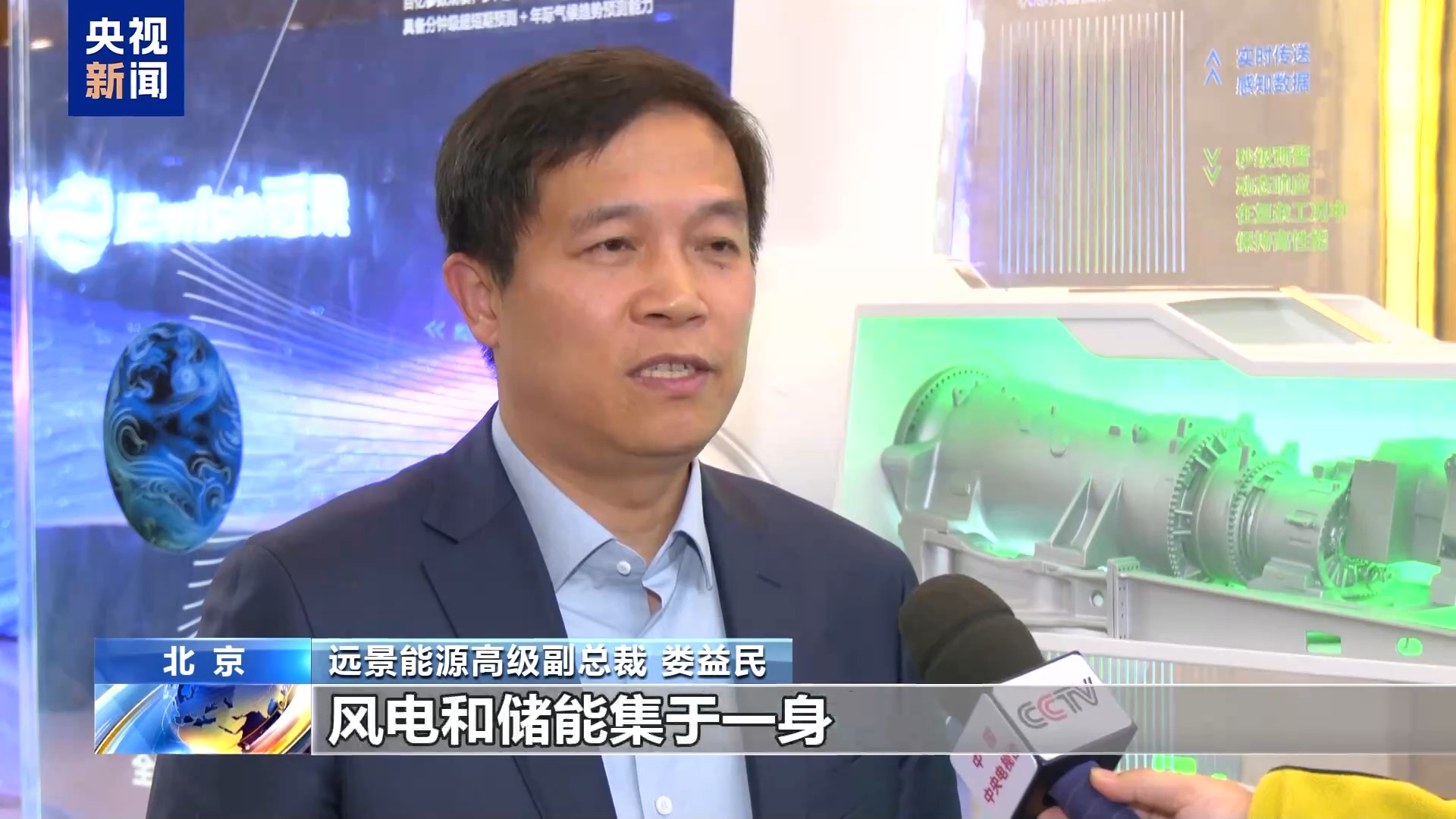 远景能源高级副总裁 娄益民:这是我们全新研发的全球首个AI风储一体机,风电和储能集于一身,就像一座独立的小型发电站。结合我们自主研发的“天机”气象大模型和“天枢”能源大模型,它化身聪明的电力“交易员”,能够让风电场的收益提升20%以上。