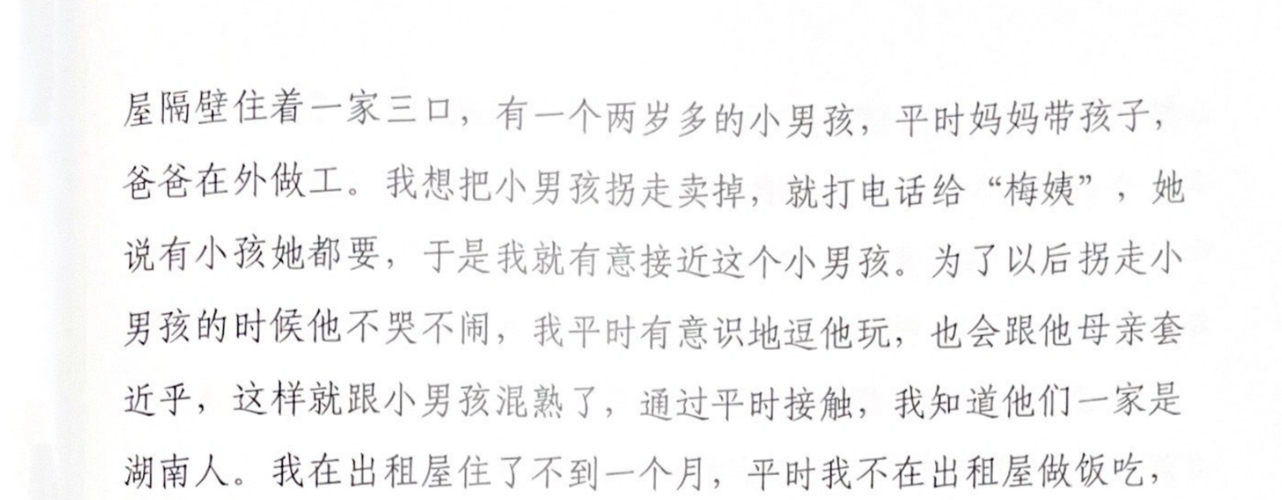 直到在2017年11月的庭审中,申军良才从张维平口中第一次听到“梅姨”这个名字。张维平供述,物色好儿童后,他通常提前和“梅姨”通电话,由“梅姨”帮忙联系买家,当他和被拐儿童一家混熟后,就找机会带走孩子,“她说有小孩她都要”。