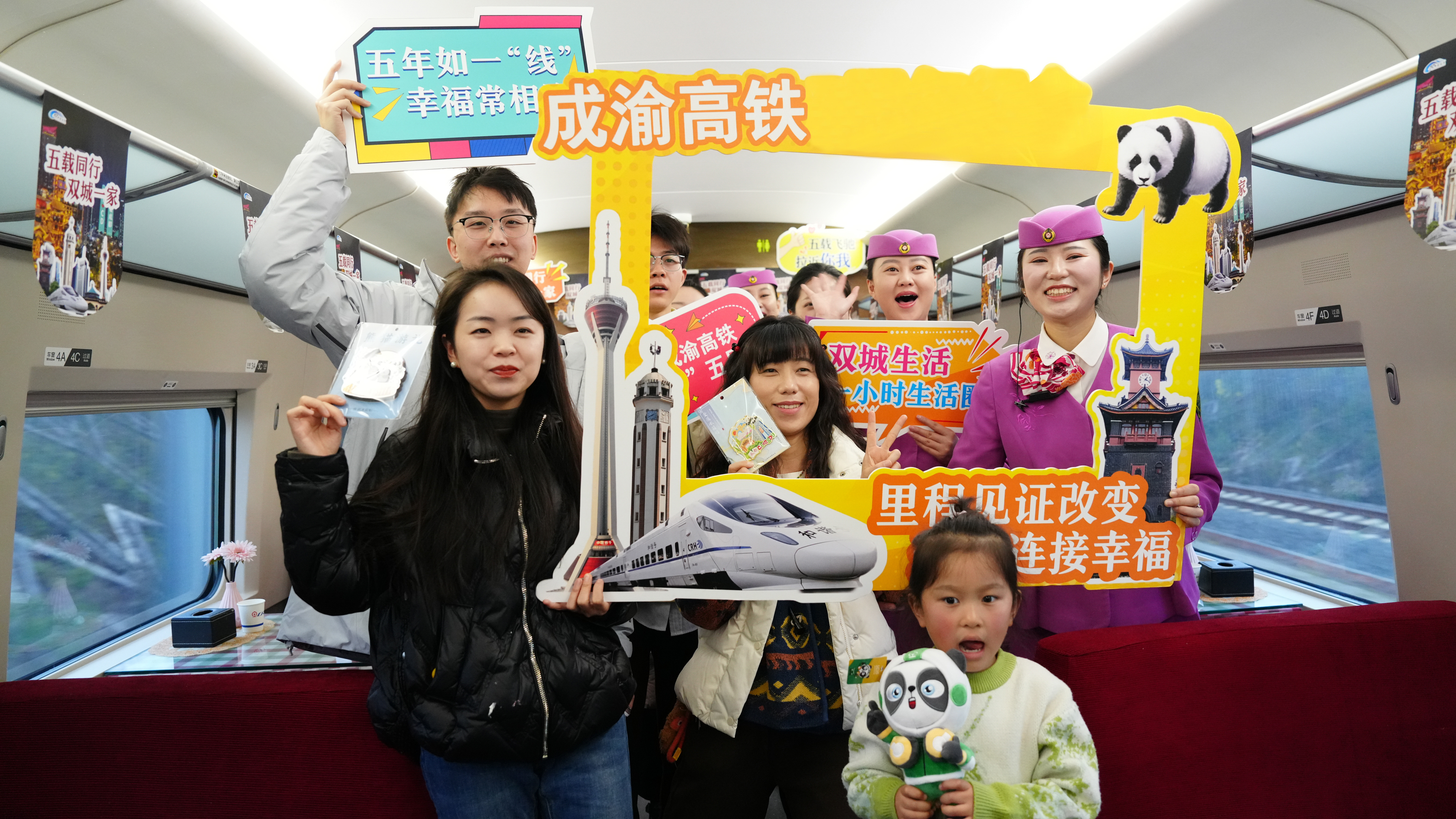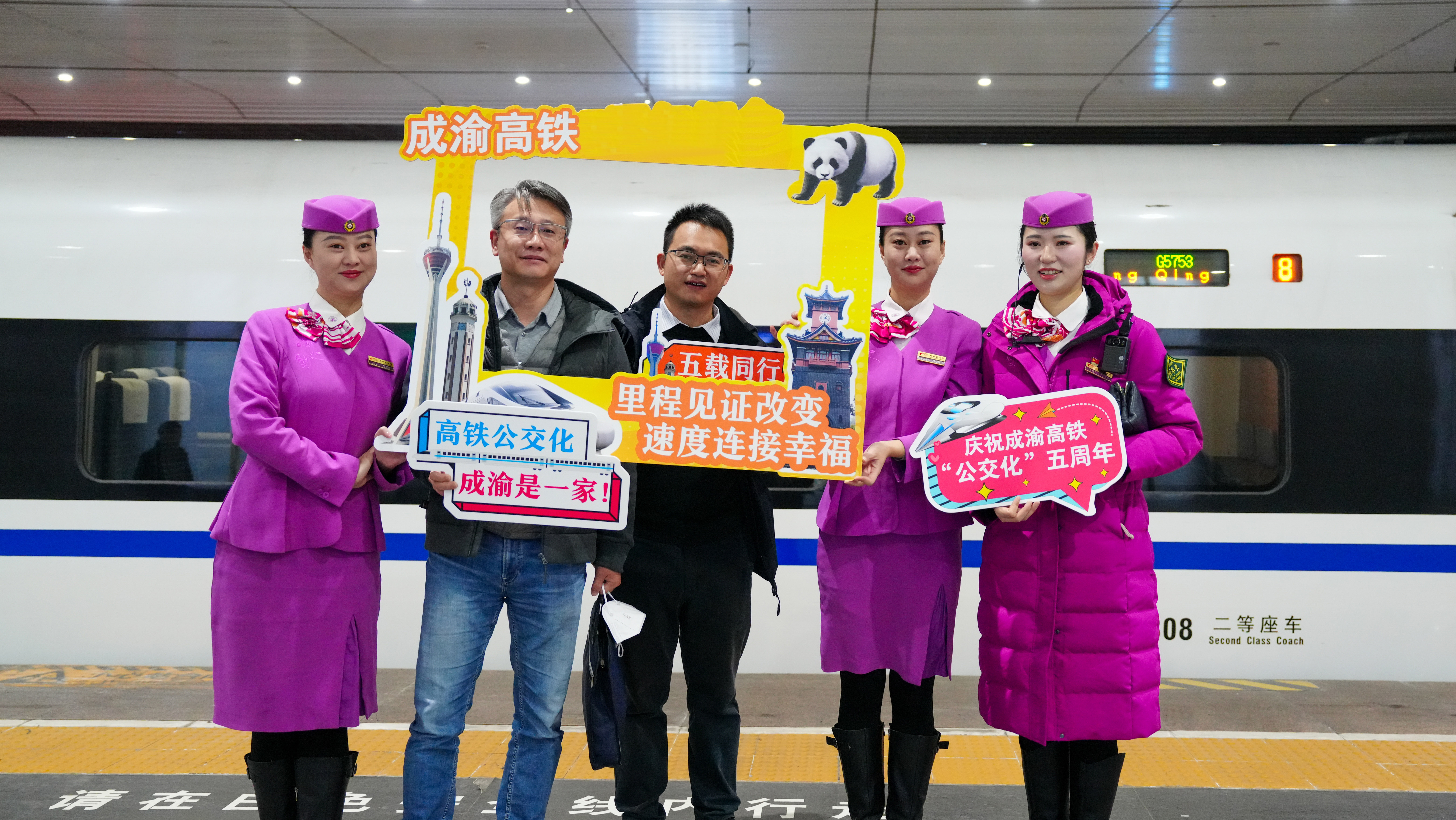 “成渝高铁公交化运营五周年快乐!”12月24日,成都东开往重庆西的G5753次列车车厢内响起阵阵欢歌,一块印有“成渝高铁公交化5周年”字样的主题蛋糕被缓缓推到旅客面前。