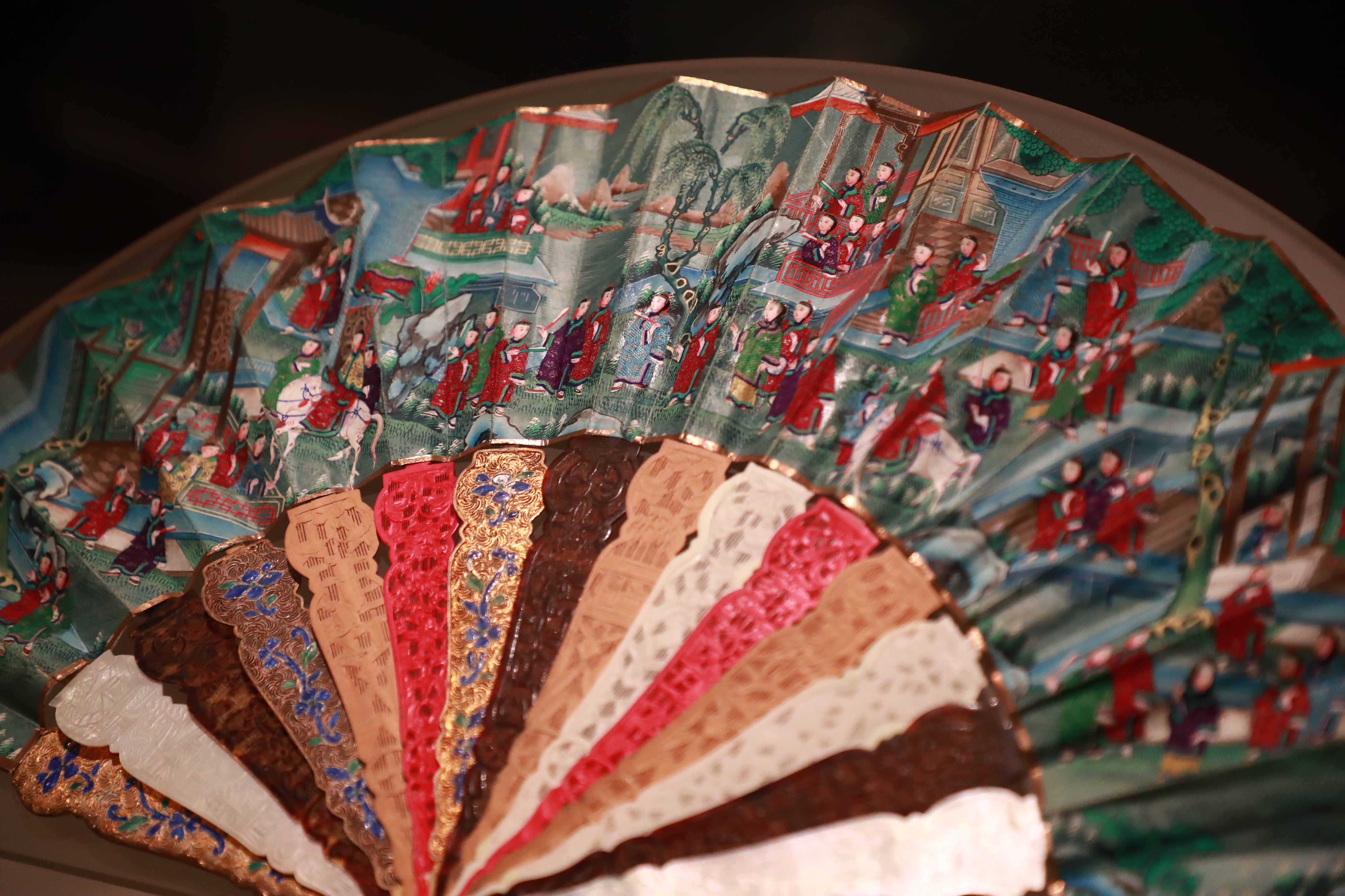 在了解外销扇历史背景的同时,随着展厅的线路走去,各种形态万千、姿态不一的精巧扇子,立即抢夺了观众的视线。这些扇子款式层出不穷,色调、质感不尽相同;更是色彩旖旎,其有彩绘西洋园林、田园风光、树木花蝶,令人叹为观止;同时,它们纹饰精美,黑漆描金、烧蓝、刺绣,构图新颖别致,色彩奇巧绚丽,往往集多种工艺于一扇,极尽装点之能事。