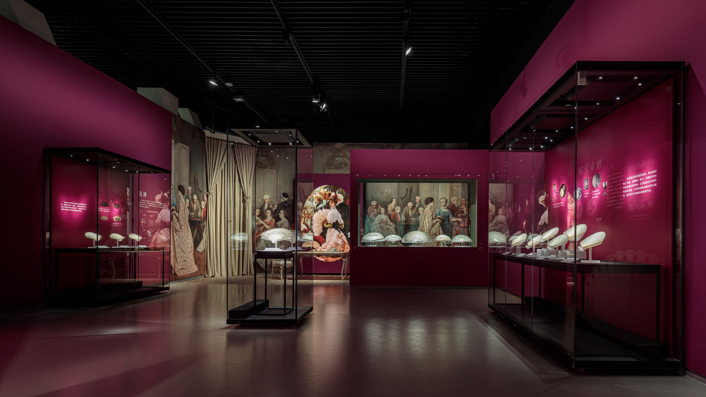 “这在一个单元的设计上,我们特别采用了红色为主要的色调,更能体现‘中国风’。也与前面的黛紫、薄荷绿也形成了反差。”展览展陈设计师段凯风这样说道。与此同时,展厅内还设计了许多可互动打卡的环节,譬如在第一单元就还原了欧洲宴会的场景,观众步入展厅中,就像穿越到数百年前,手持羽毛扇在宴会中摇曳生姿。