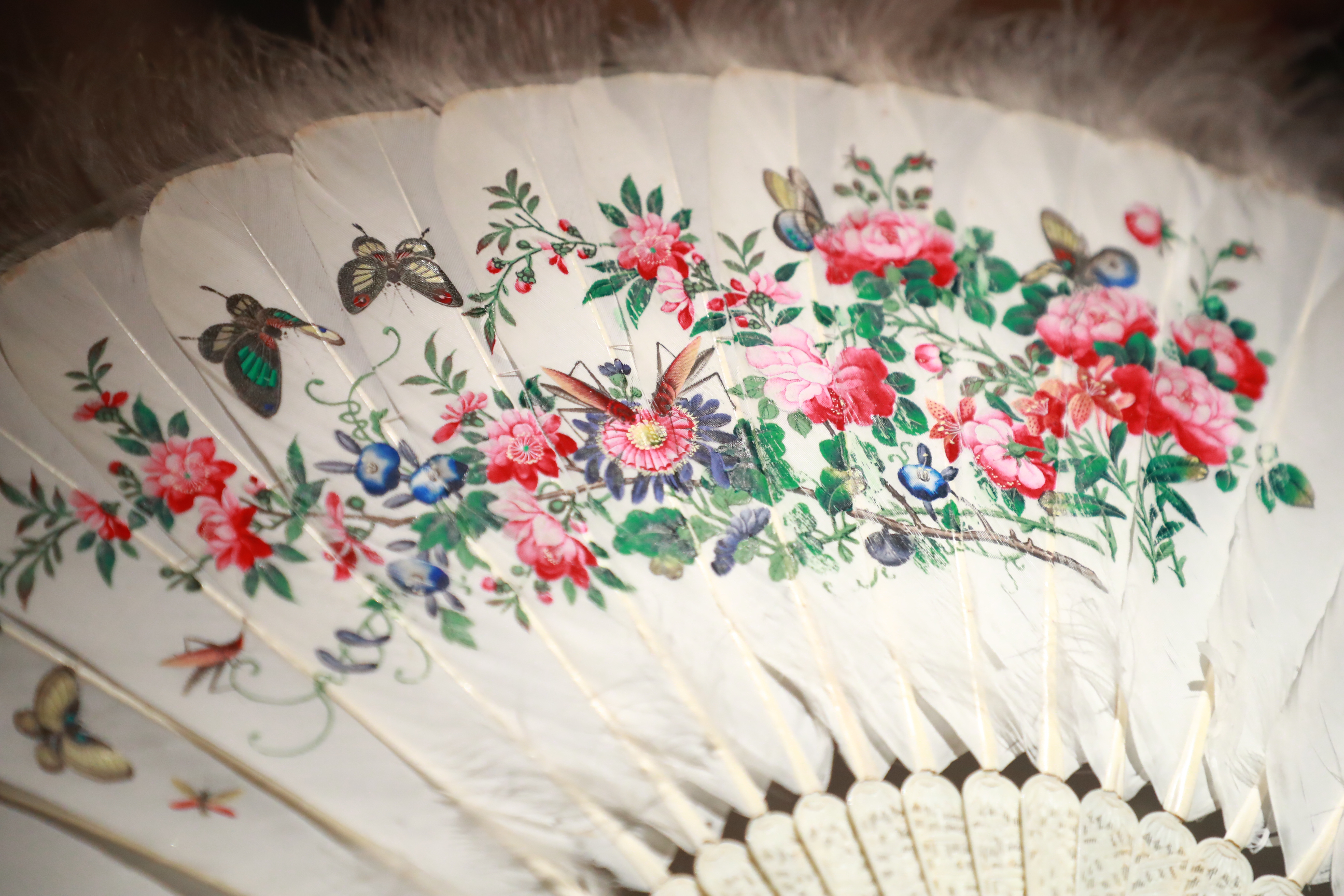 象牙骨鹅毛彩绘花蝶扇 清道光