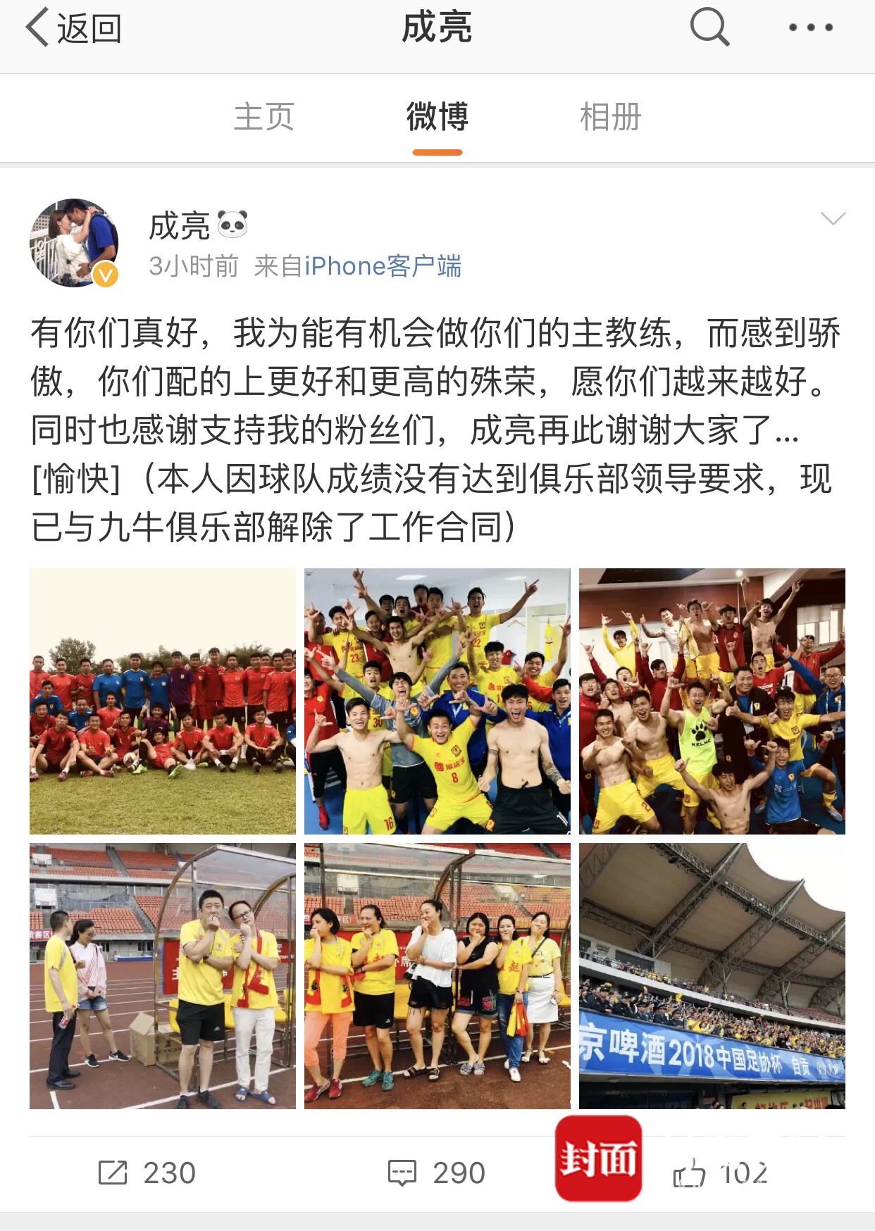 今天下午4点过,成亮在新浪微博上说道:“有你们真好,我为能有机会做你们的主教练,而感到骄傲,你们配的上更好和更高的殊荣,愿你们越来越好。同时也感谢支持我的粉丝们,成亮再此谢谢大家了……(本人因球队成绩没有达到俱乐部领导要求,现已与九牛俱乐部解除了工作合同) 。”