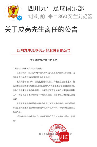 随后,四川九牛俱乐部官方也发布公告,宣布了成亮不再担任球队主教练的消息。