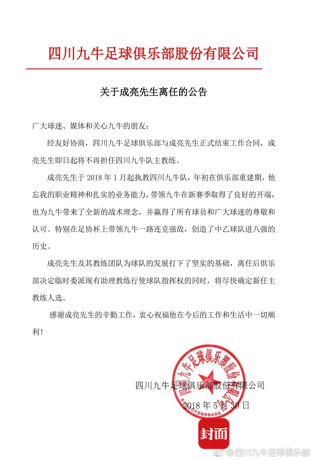 四川九牛俱乐部表示,成亮先生于2018年1月起执教四川九牛队,年初在俱乐部重建期,他忘我的职业精神和扎实的业务能力,带领九牛在新赛季取得了良好的开端,也为九牛带来了全新的战术理念,并赢得了所有球员和广大球迷的尊敬和认可。特别在足协杯上带领九牛一路连克强敌,创造了中乙球队进八强的历史。成亮先生及其教练团队为球队的发展打下了坚实的基础,离任后俱乐部决定临时委派现有助理教练行使球队指挥权的同时,将尽快确定新任主教练人选。
