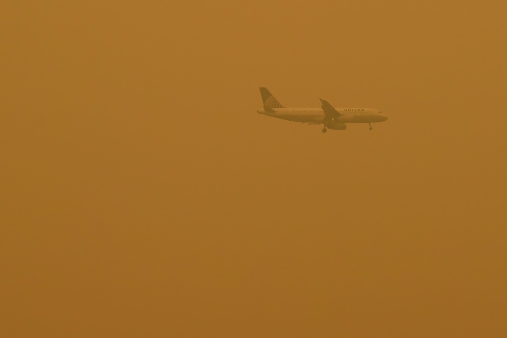 6月7日,一架飞机从烟尘笼罩的美国纽约上空飞过。新华社记者李睿摄