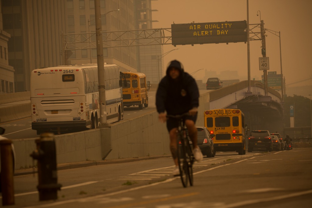 7日,纽约市标志性的天际线在烟雾笼罩下已难以看清,海滩等户外活动场所关闭,中央公园动物园也因动物需留在室内而提前关门。
