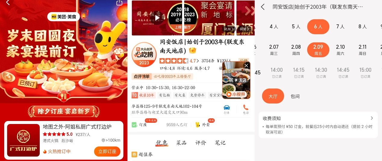 不少餐饮商户通过线上平台推出了低折年夜饭、团圆餐等到店套餐,提前锁定市民游客的堂食需求。美团相关负责人表示,平台已设置“岁末团圆夜家宴提前订”线上专区,即日起到春节期间全程推广提供此类服务的门店,帮助门店提升订单,增加确定性收益。