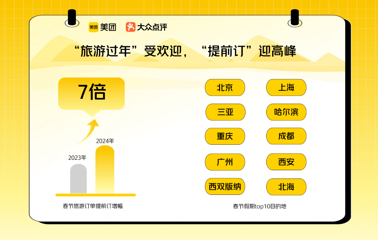 美团、大众点评数据显示,截至1月21日,年三十至大年初八的旅游消费(含酒店民宿、景点门票、交通等)提前预订量较去年增长约7倍。北京、上海、三亚、哈尔滨、重庆、成都、广州、西安、西双版纳、北海成为top10的目的地。