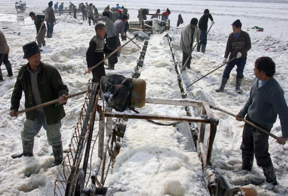 2009年2月11日,铲硝工人在运城盐湖铲收芒硝。