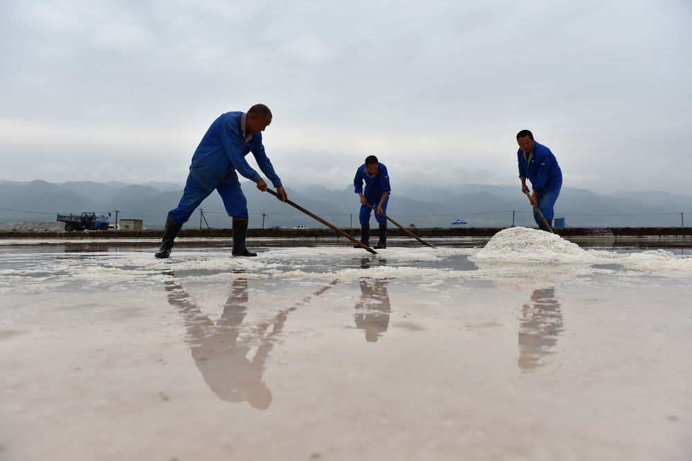 2016年8月25日,工人在运城盐湖进行扒盐作业。