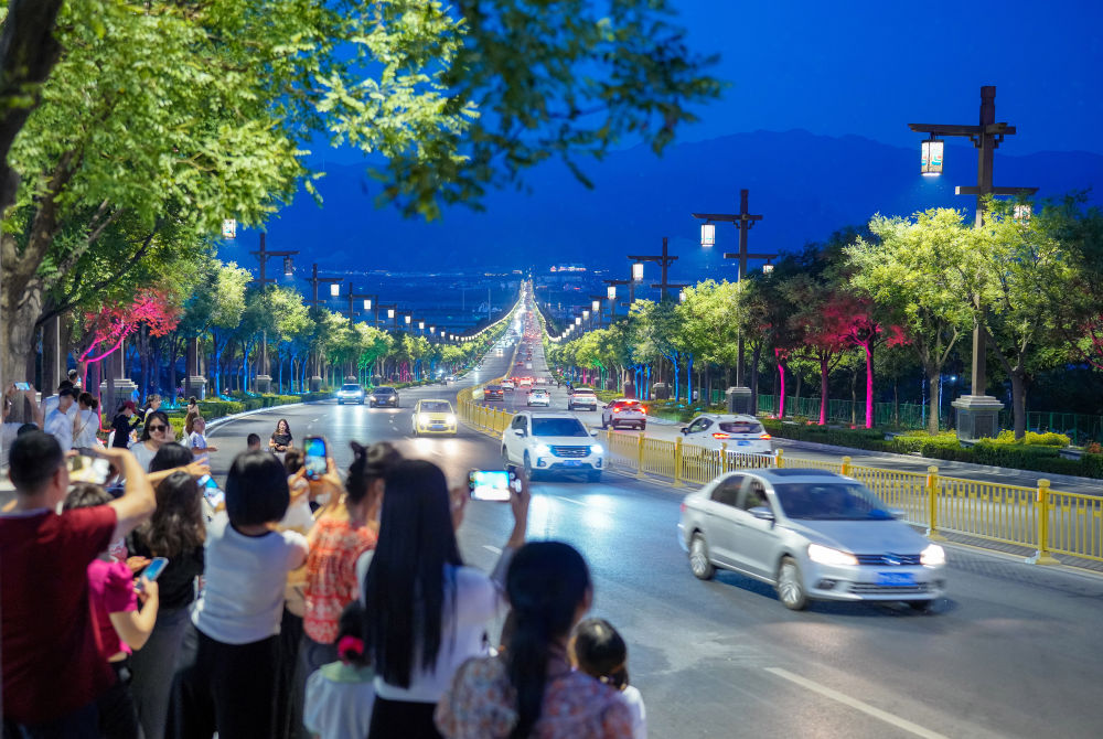 2024年5月21日,游客在升级改造后的运城市“盐湖006号灯杆”观景台拍照。