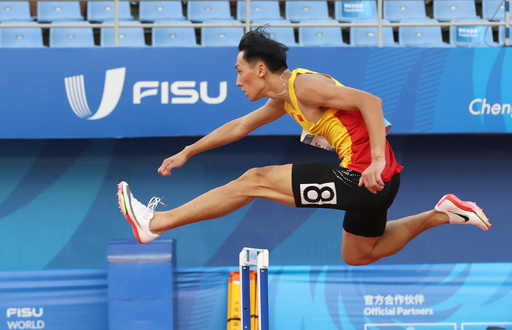 8月4日,成都大运会,谢智宇在男子400米跨栏决赛中。新华社记者李京摄