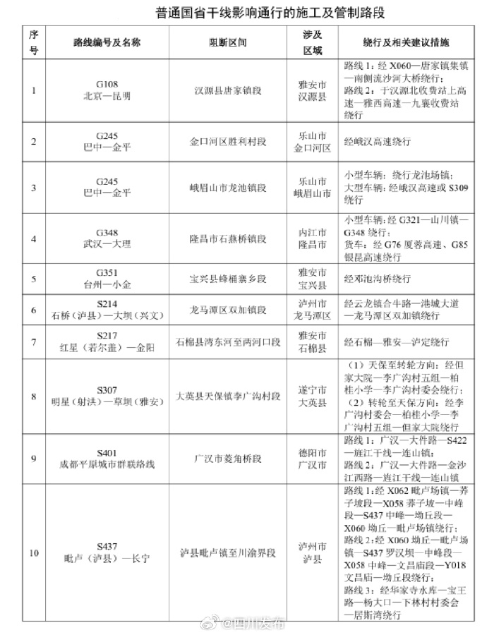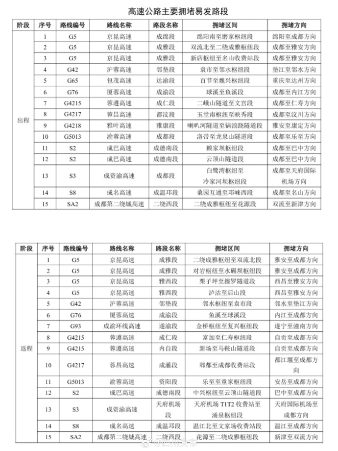 “五一”小长假临近,今年假期期间,七座以下(含七座)小型客车上高速公路继续免收通行费,免费通行时间为5月1日0时至5月5日24时,共计5天。四川公安交警对2026年五一假期道路交通安全形势进行了研判,易堵路段如下↓↓