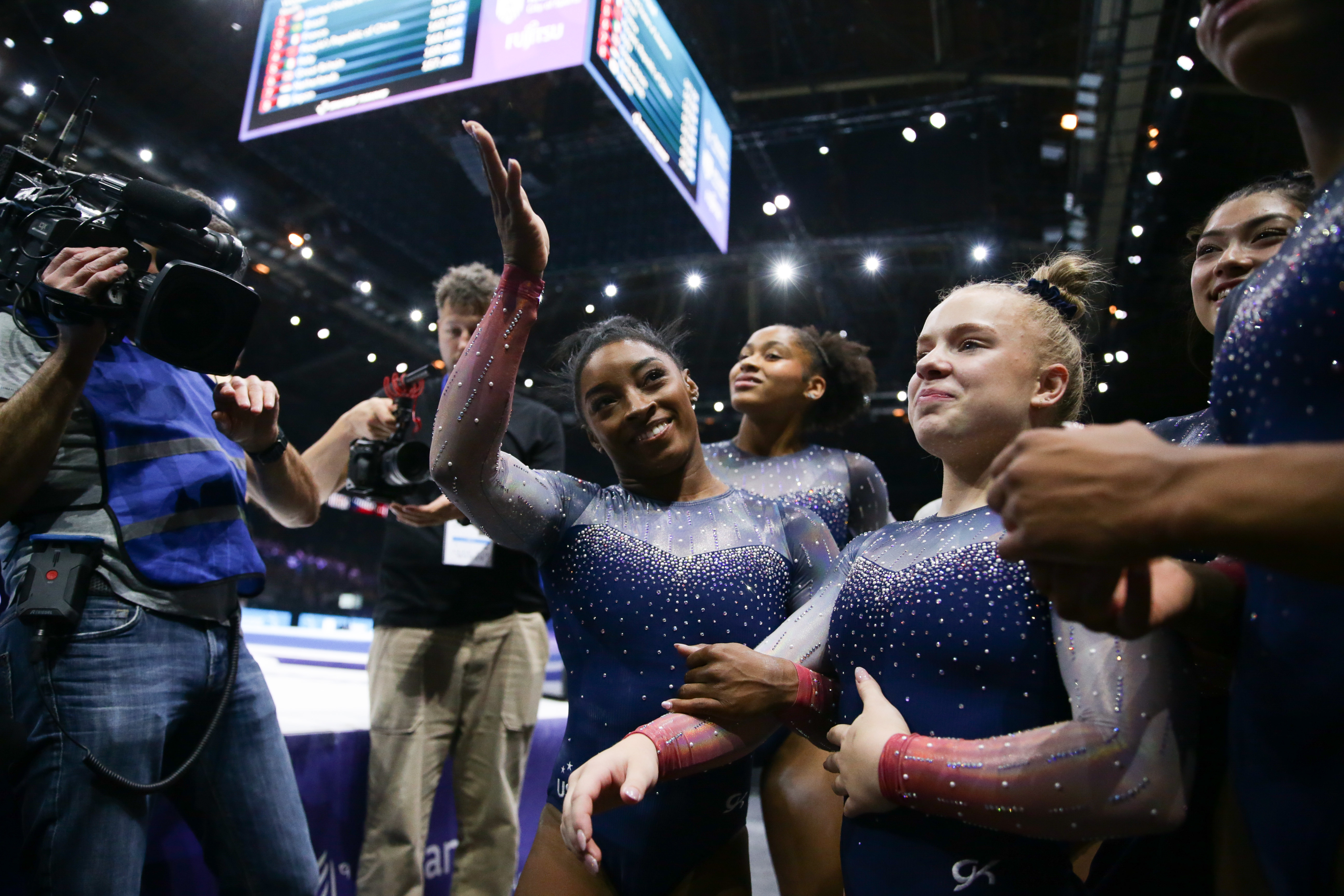 10月4日,美国队选手拜尔斯(左)在女子团体决赛后挥手致意。新华社记者 郑焕松 摄