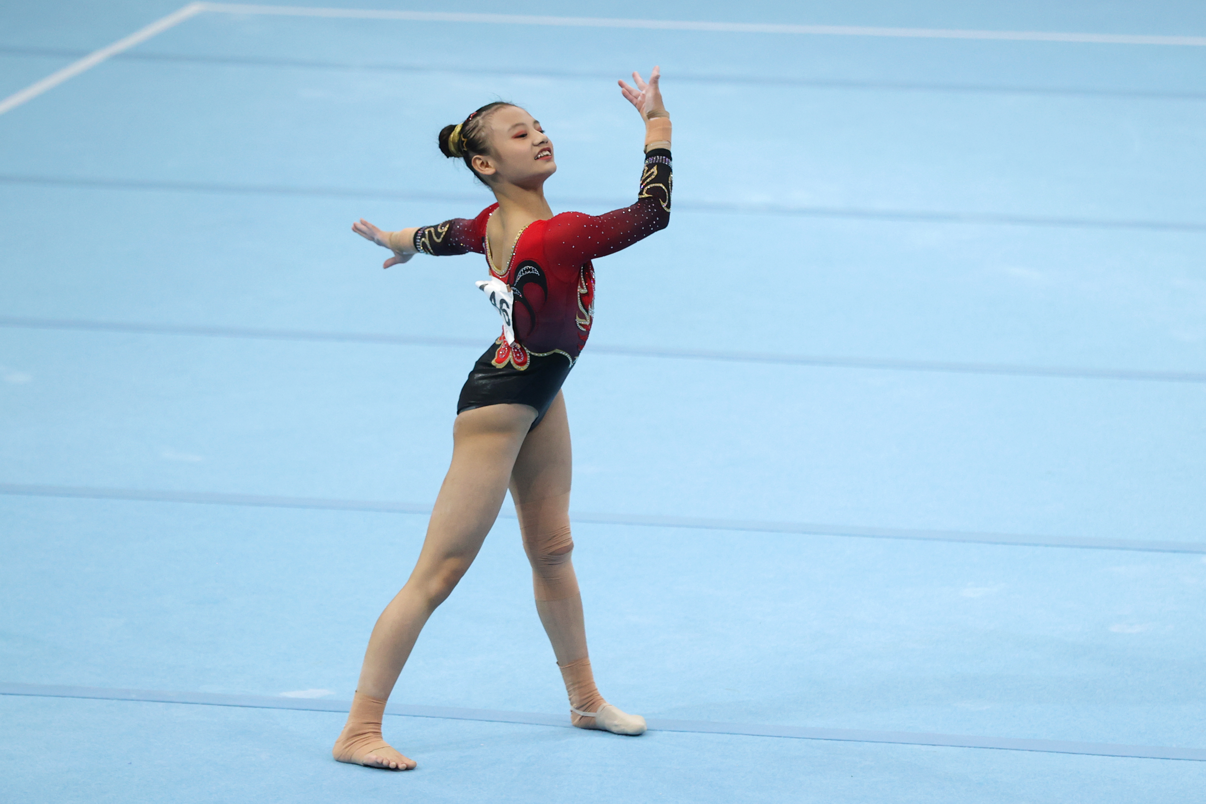 10月4日,中国队选手邱祺缘在女子团体决赛自由操项目比赛中。新华社记者 赵丁喆 摄