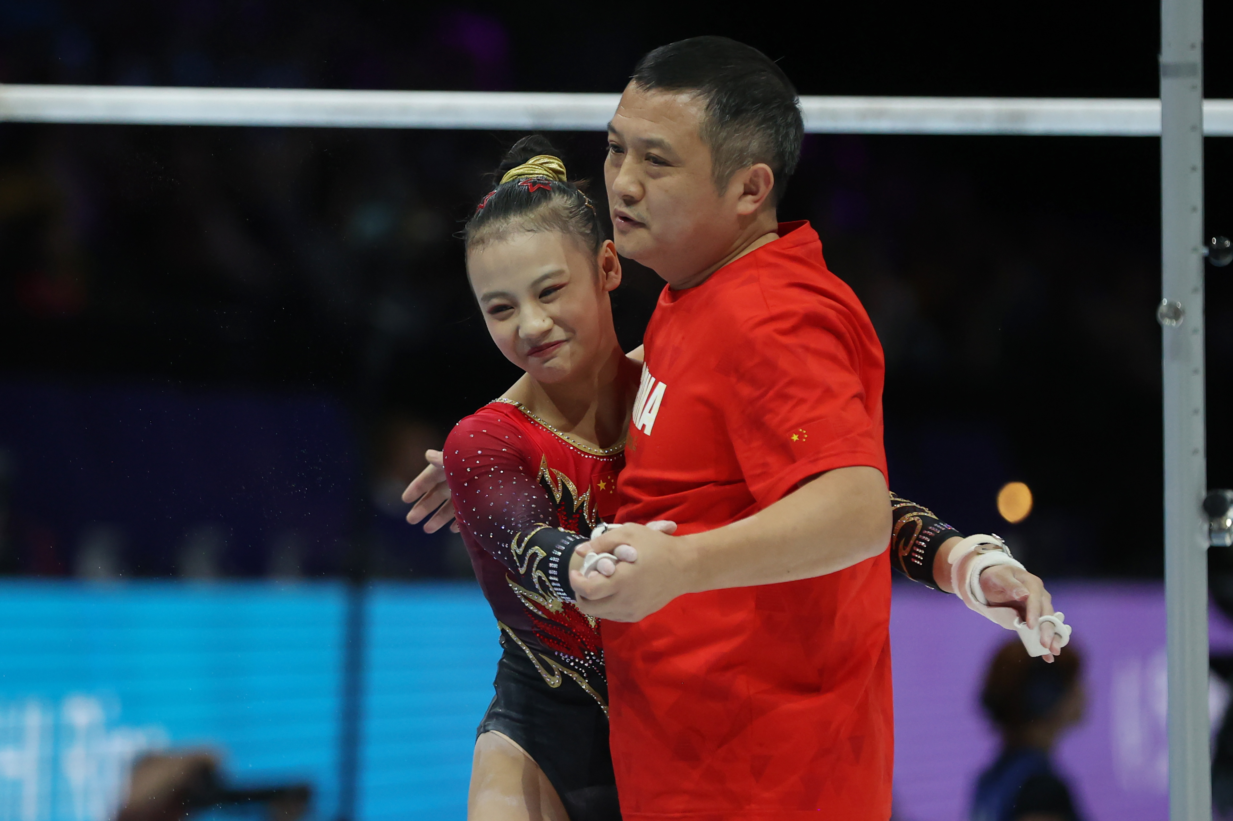10月4日,中国队选手邱祺缘(左)在女子团体决赛高低杠项目比赛后与教练拥抱庆祝。新华社记者 赵丁喆 摄