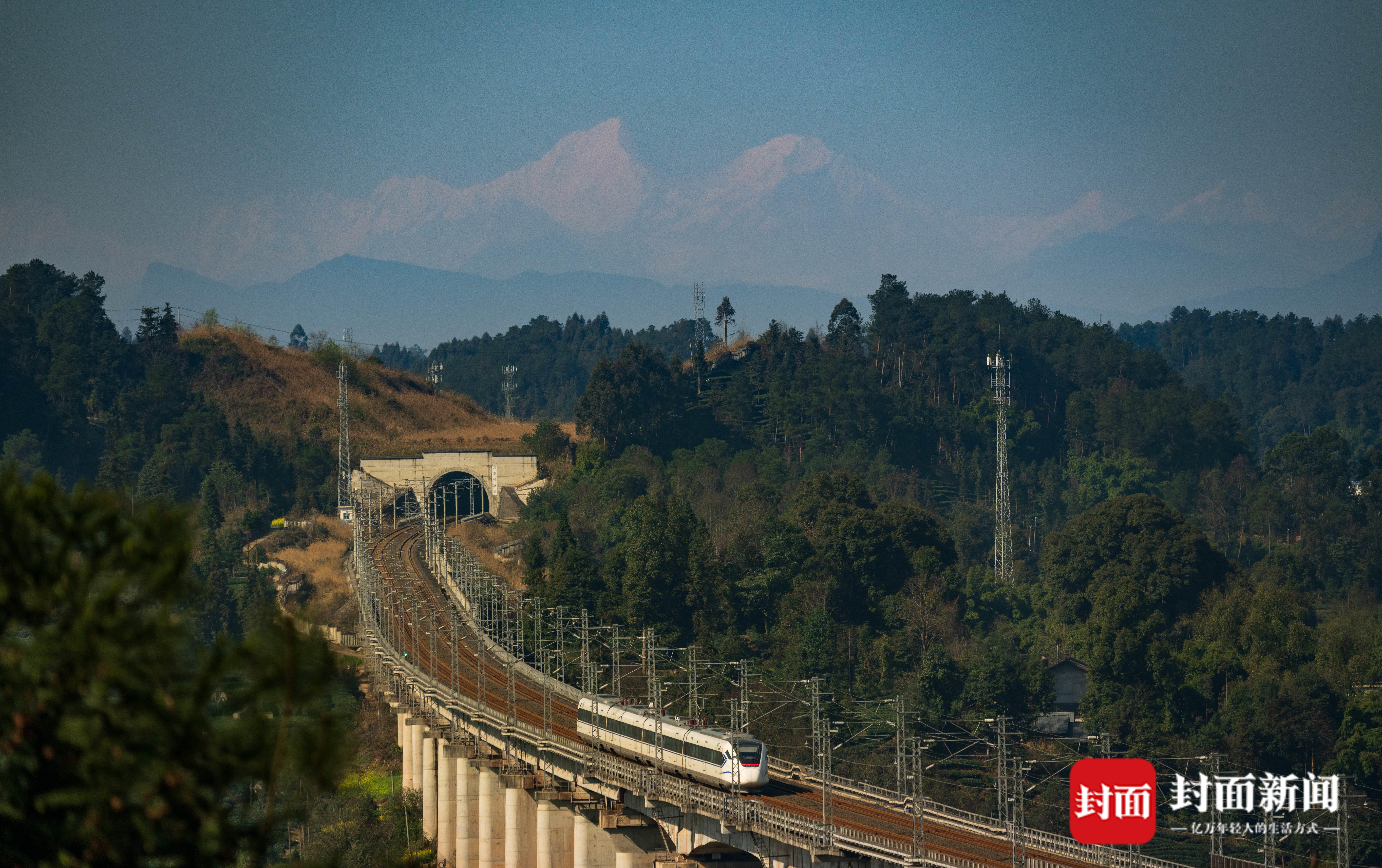 成雅铁路蒲江段,长焦镜头下,列车仿佛从贡嘎雪山方向驶来。