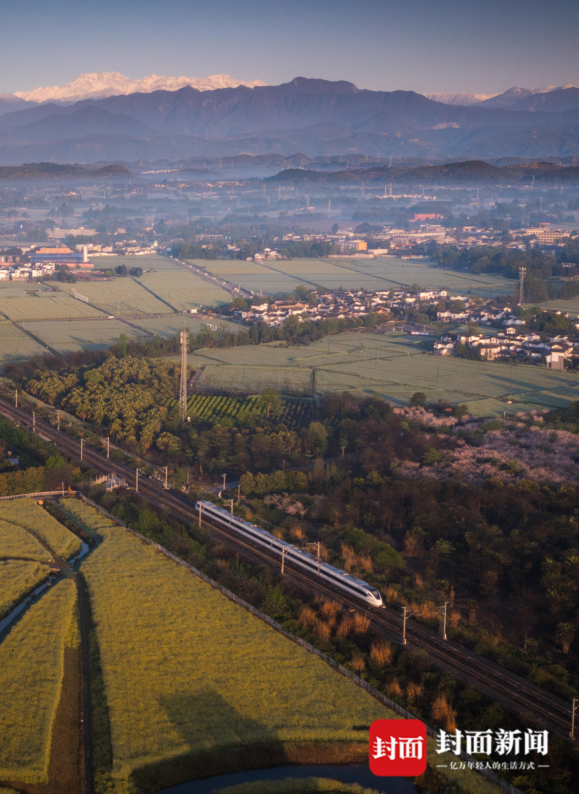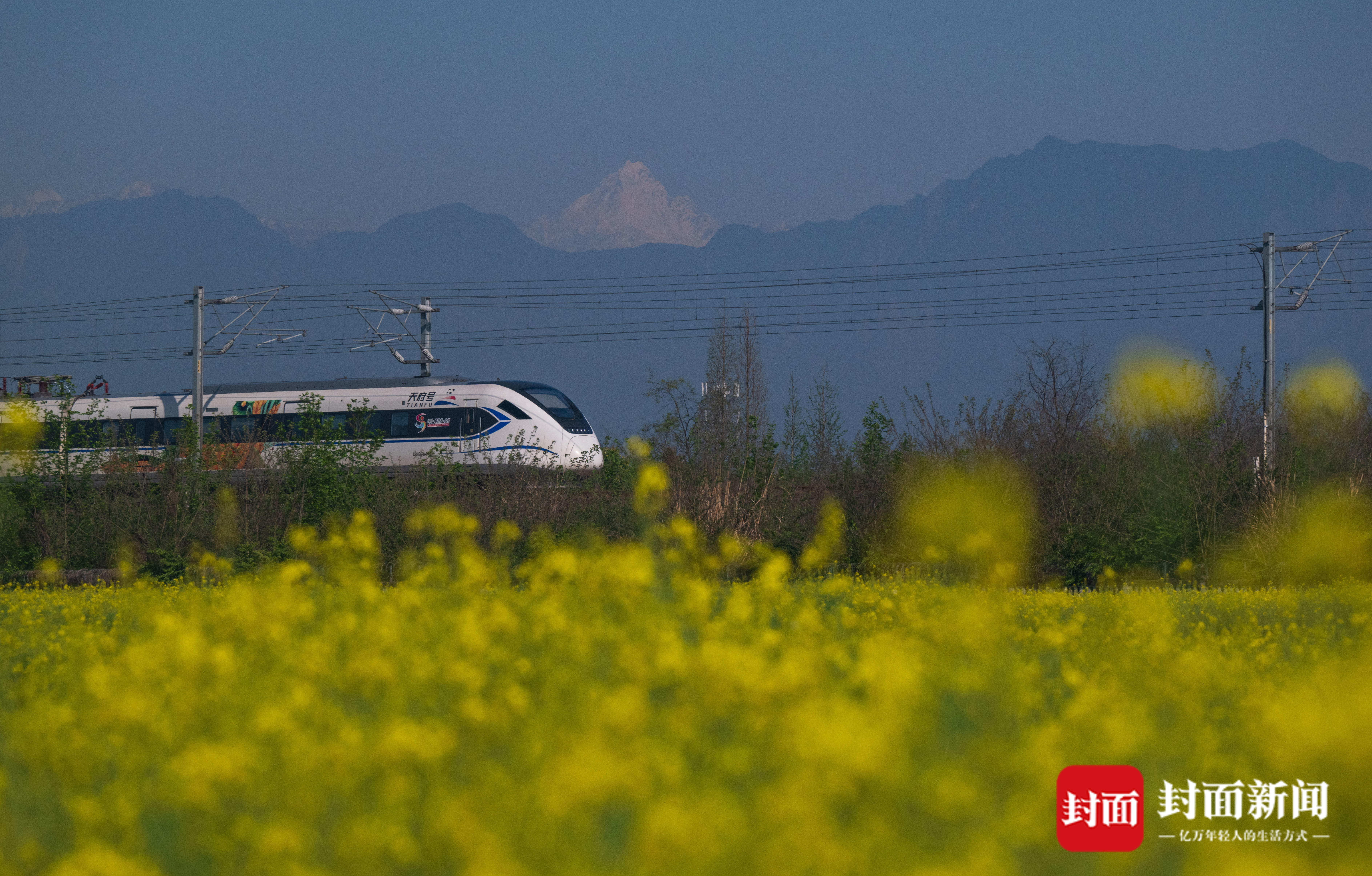 成雅铁路崇州段,列车经过油菜花田,从四姑娘山幺妹峰下穿过。
