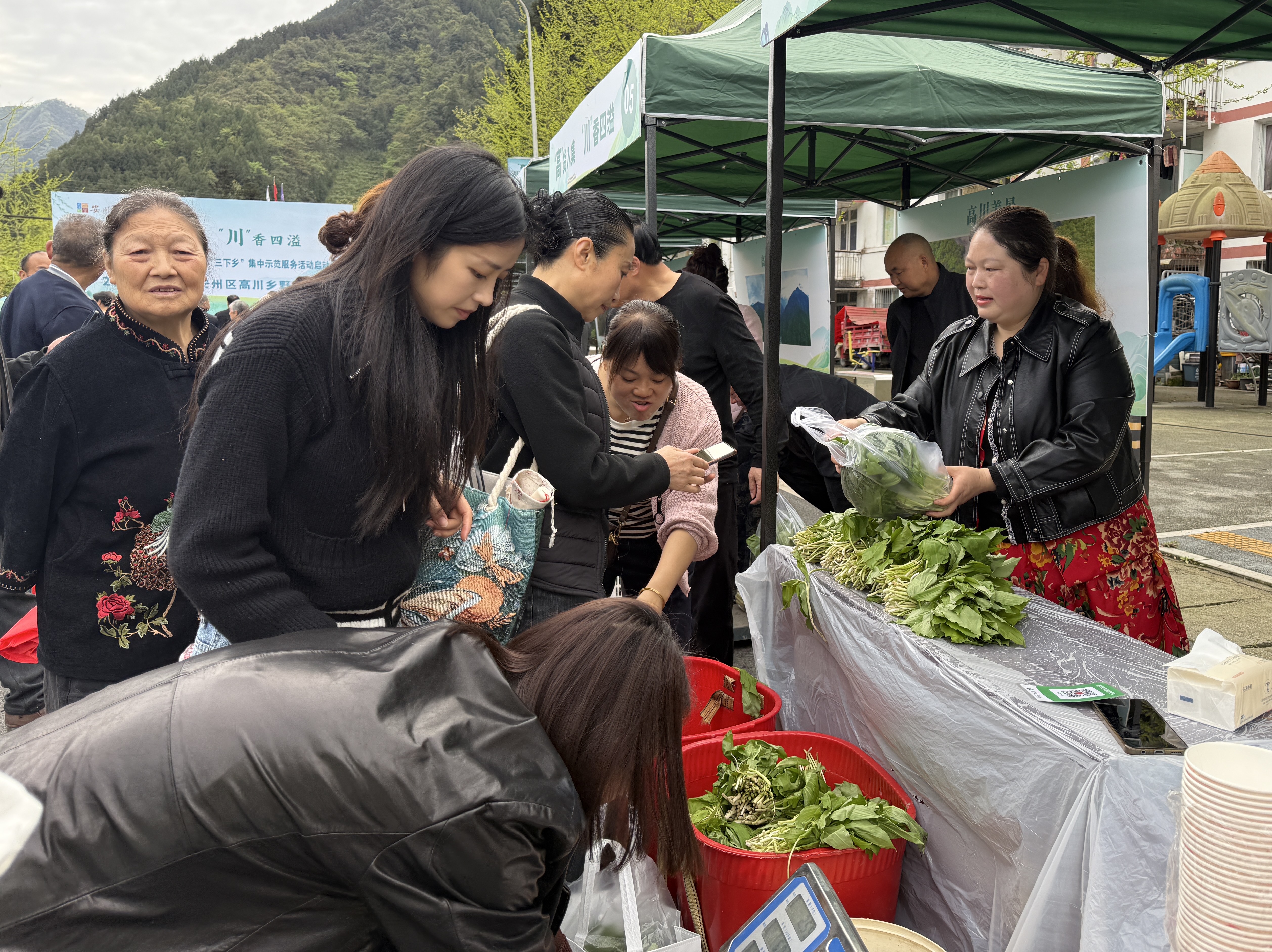 活动现场,一里长的街道变成了山野集市:鹿耳韭、刺龙苞、香椿、笋子、土蜂蜜、跑山鸡、冷水鱼、魔芋豆腐等山货琳琅满目。现场还增设了野菜美食和互动体验区,不少孩子在家长的带领下动手体验,包鹿耳韭饺子、蒸肉包子,欢声笑语不断。