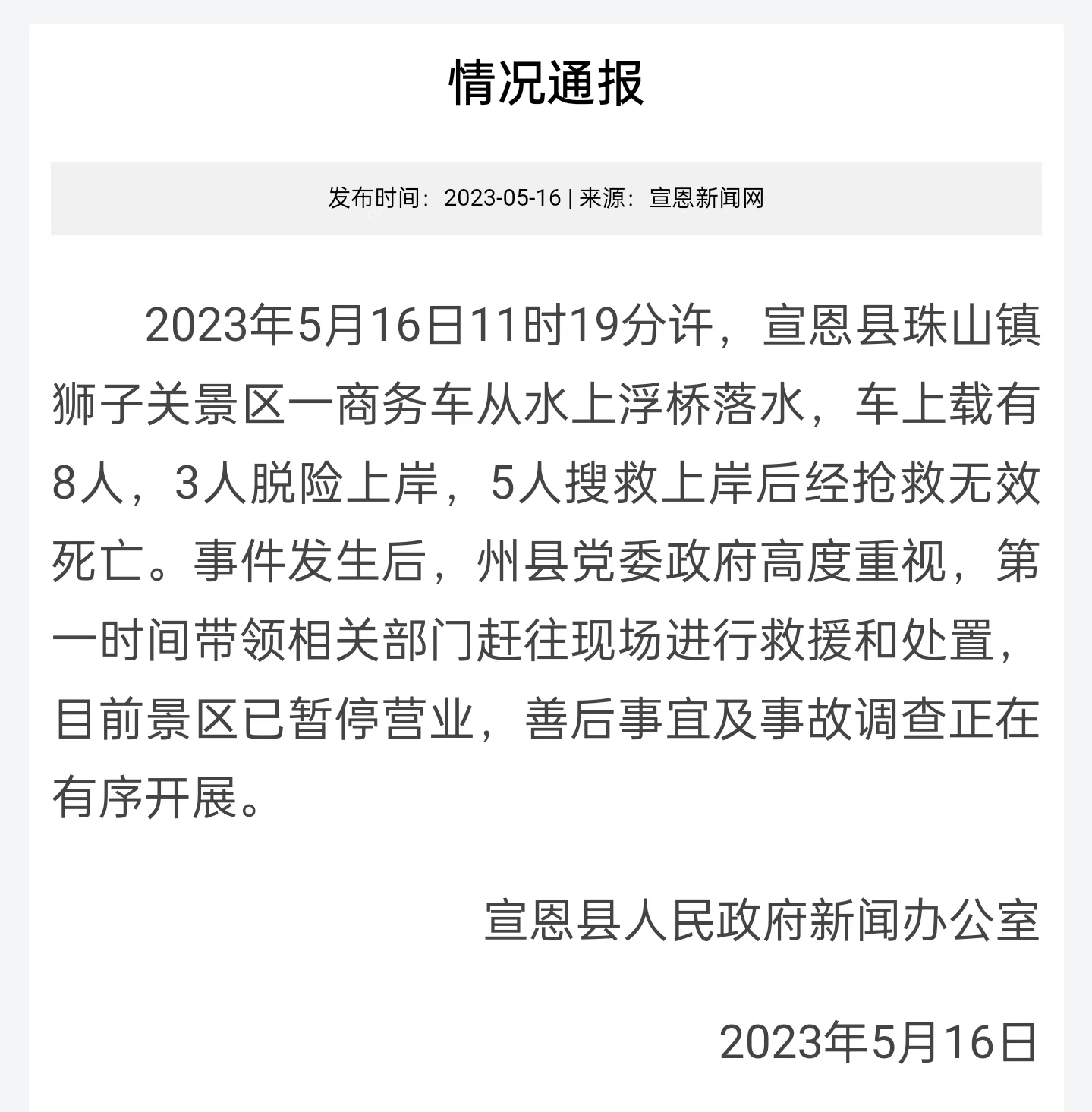 5月16日,恩施狮子关景区网红浮桥游览车坠河导致5名游客死亡。知情人告诉封面新闻记者,车上8人均来自山西长治,死者中3名女性2名男性,年龄都在50岁至55岁,没有姓氏相同的情况。