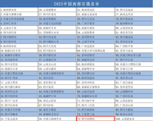近日,《中国西部地区县域发展监测报告2022》发布,同时揭晓了“2022中国西部百强县市”和“2022中国西部百强区”名单。其中,富顺县入选2022中国西部百强县市。