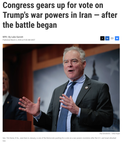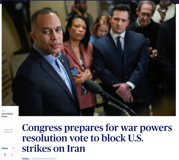 这项针对对伊朗行动的“战争权力决议”,核心目的即是要求总统若继续或扩大军事行动,必须事先获得国会授权,而不能再以“延续旧授权”或所谓“单方面自卫”为由,无限期扩大作战范围。这表明国会在试图通过制度手段,将总统重新拉回宪法设定的权力框架内。