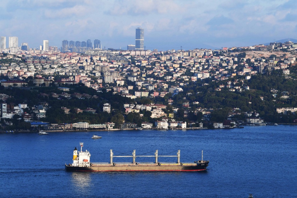 2022年8月7日,一艘从乌克兰出发的运粮船驶过土耳其伊斯坦布尔博斯普鲁斯海峡。新华社记者沙达提摄