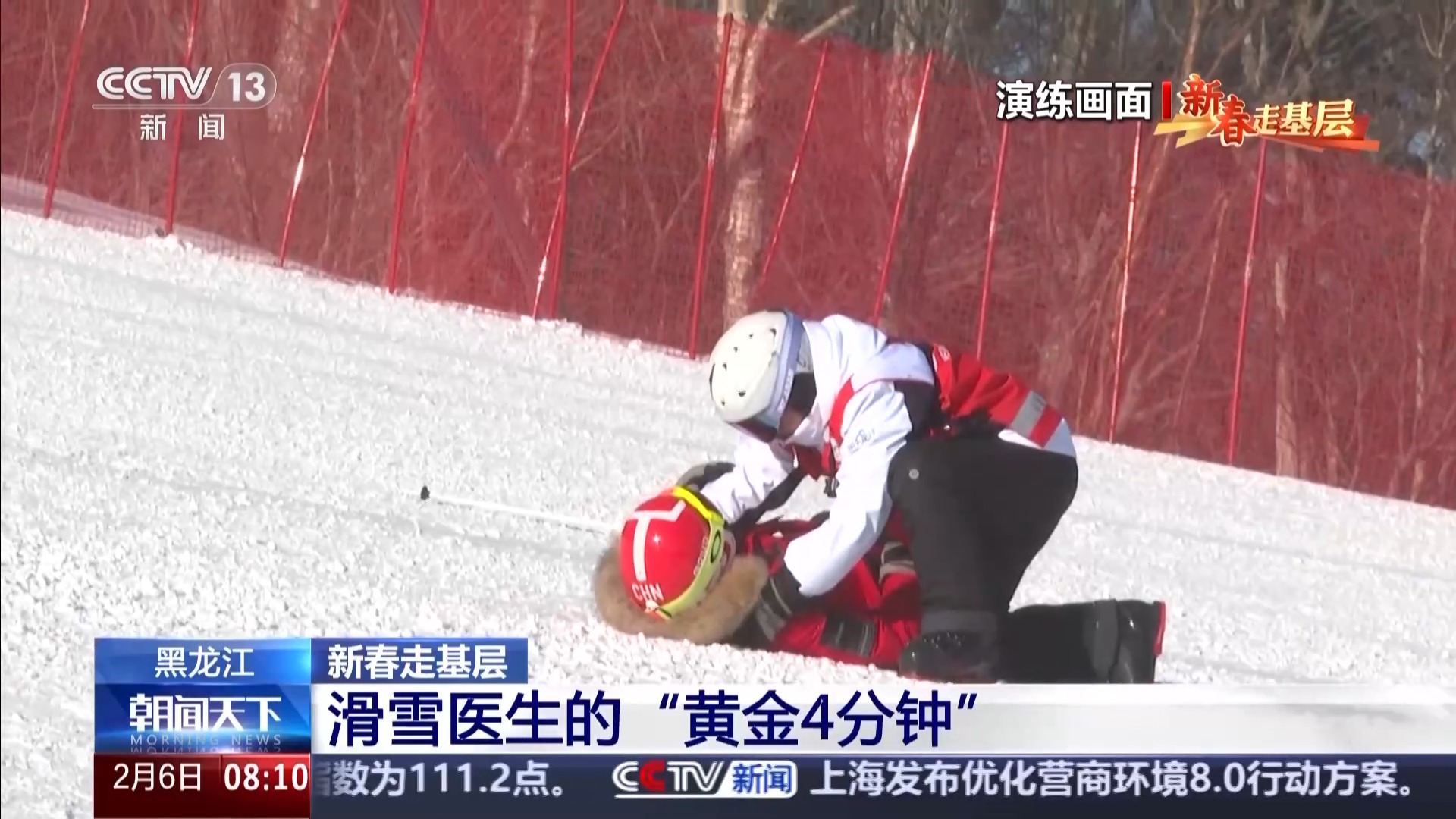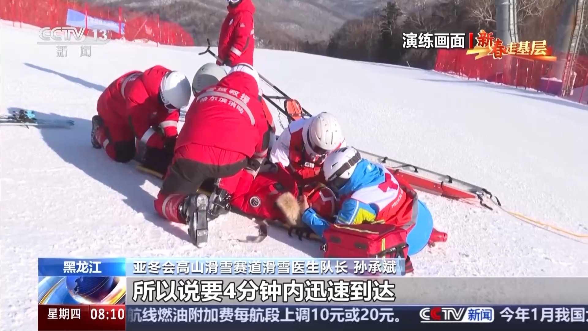 亚冬会高山滑雪赛道滑雪医生队长 孙承斌:刚才模拟的是头部外伤、颈部外伤、脑震荡这么一个伤情。这是高山滑雪里面最常出现的伤情。如果有严重损伤,考虑到病人的愈后和脑死亡时间,所以说要4分钟内迅速到达,尽快处理,然后进行转运,到山下的运动员医疗站或者是定点医院进行救治。
