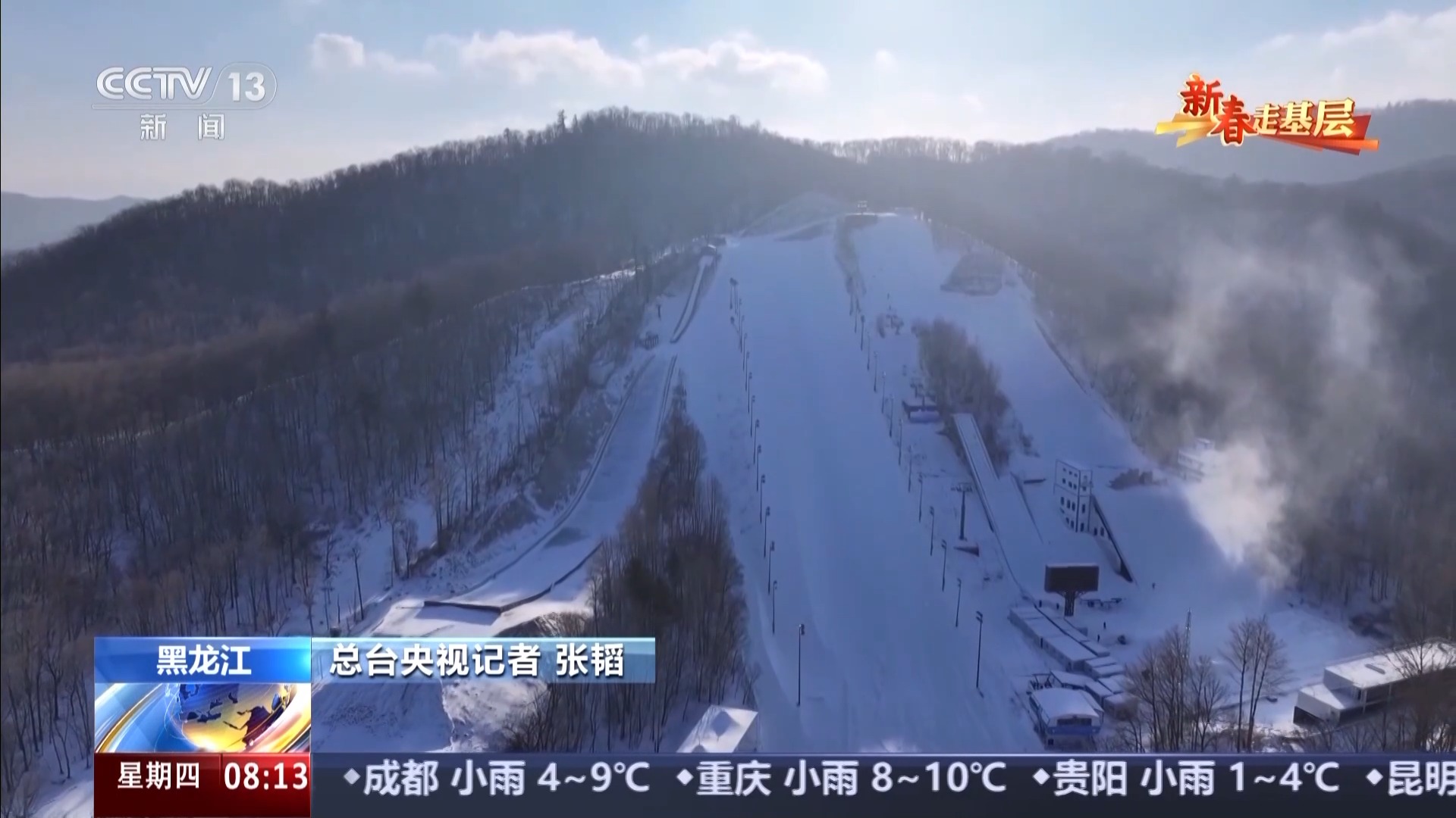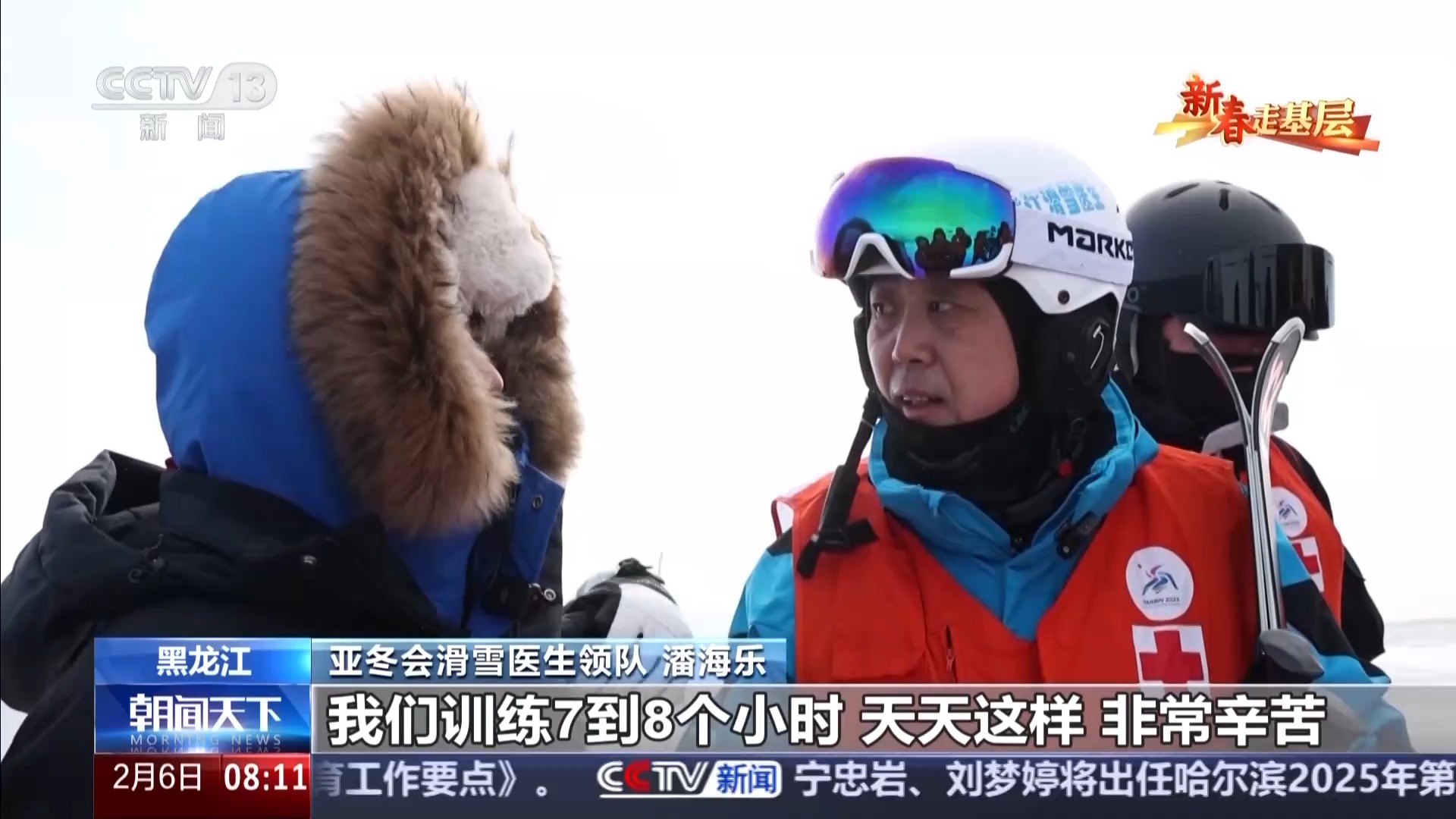 亚冬会滑雪医生领队 潘海乐:基本上从早上9时开始一直到下午4时,我们训练7到8个小时,天天这样。非常辛苦,尤其是穿得少,还得背着我们的急救包,正规比赛我们要带氧气瓶30斤,背着包进行训练也非常辛苦。