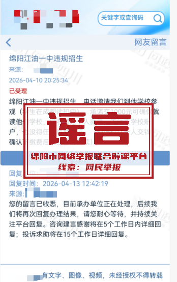 近日,有网民通过问政平台反映“绵阳江油一中违规招生,以个人微信收取1000元费用、承诺确保就读”的问题。经江油市教育主管部门联合江油市第一中学核查,上述信息纯属谣言,系虚假招生信息,现郑重澄清事实,提醒广大家长。