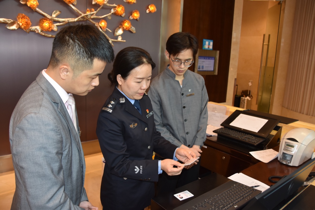 出入境民警指导酒店前台人员识别新版外国人永居证。
