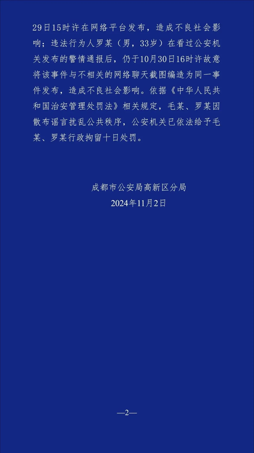 针对网传信息,11月2日,成都市公安局高新区分局发布警情续报: