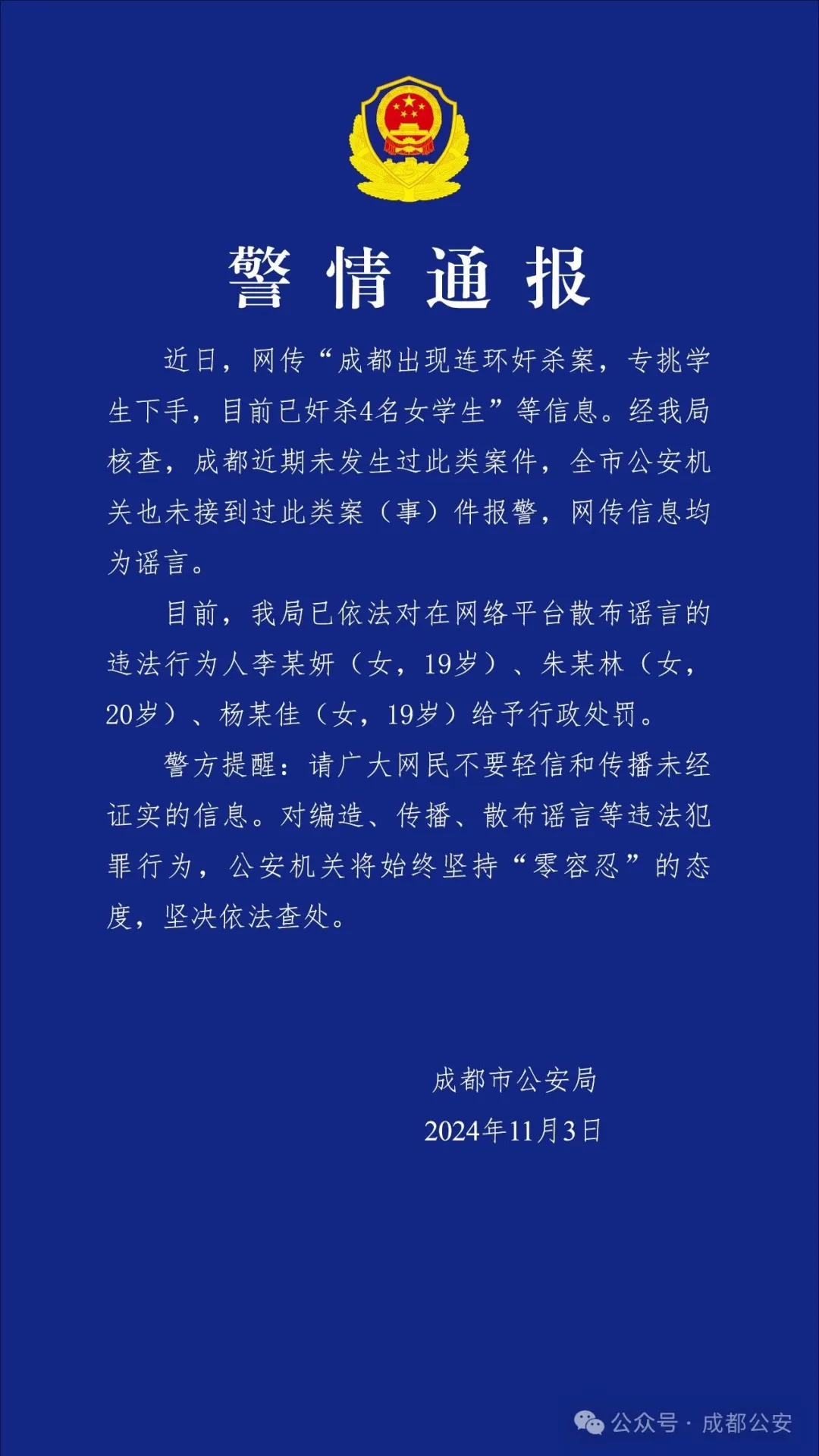 11月3日晚,成都市公安局发布一则警情通报: