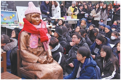韩国民众在首都首尔一处象征日军“慰安妇”受害者的“和平少女”雕像周围举行抗议活动。 本报记者 陈尚文摄