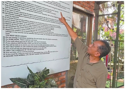 马来西亚槟城战争博物馆创建者佐哈里在展板前介绍日军占领槟城后发布的“38项严令”。 本报记者 白元琪摄