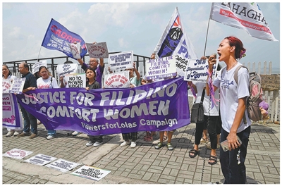 菲律宾民众在首都马尼拉一尊“慰安妇”雕像旧址附近举行二战结束80年纪念活动。 泰德·阿尔希贝摄(影像中国)