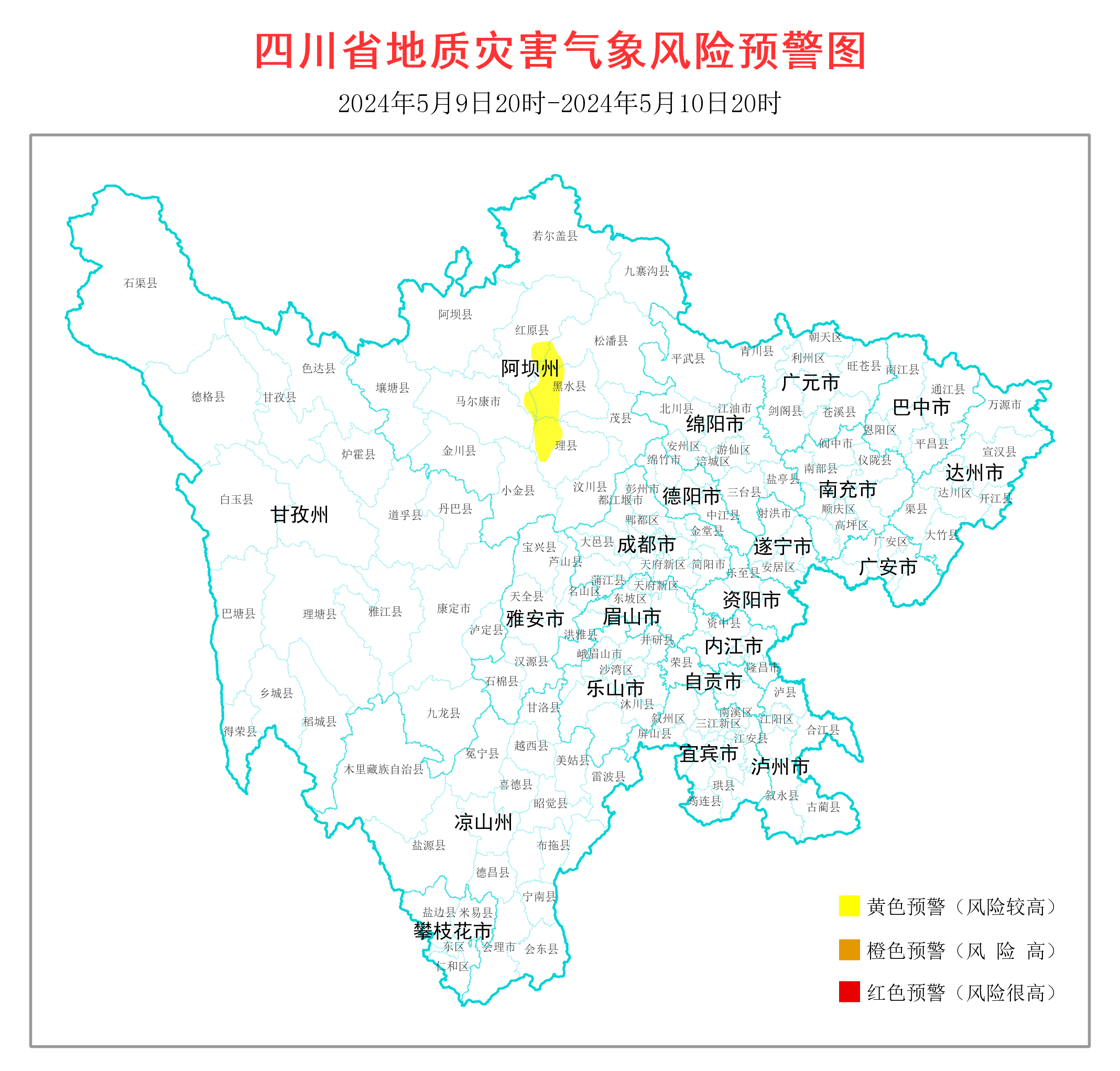 根据四川省气象台天气预报情况,结合四川省地质环境条件,5月9日20时至5月10日20时,全省地质灾害气象风险预警结果如下: