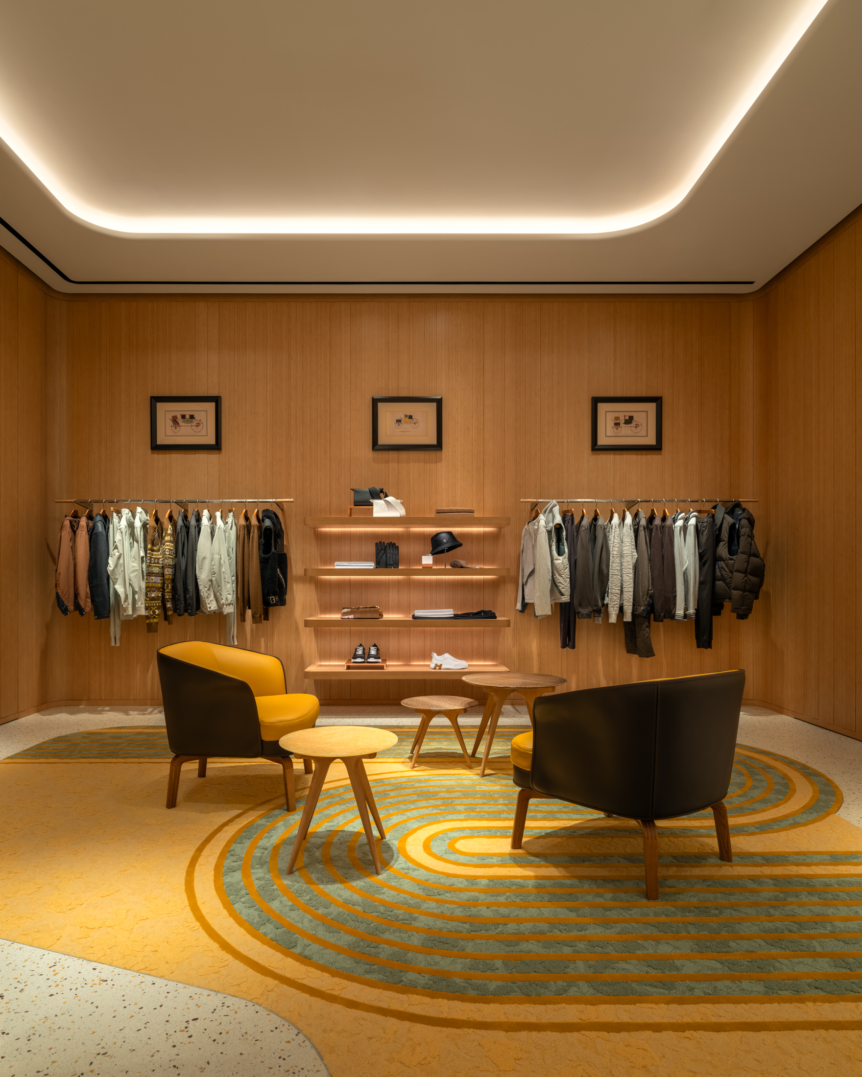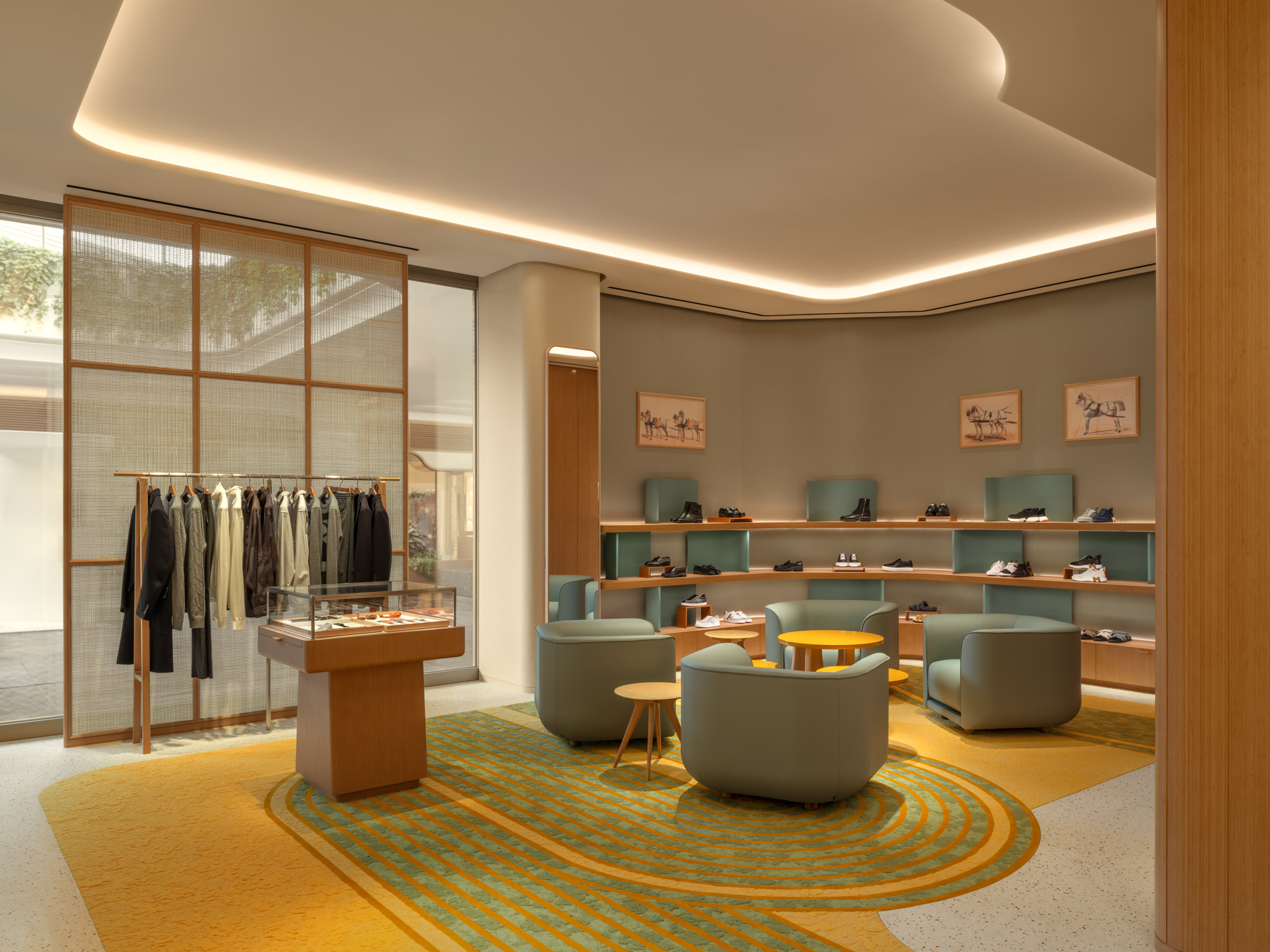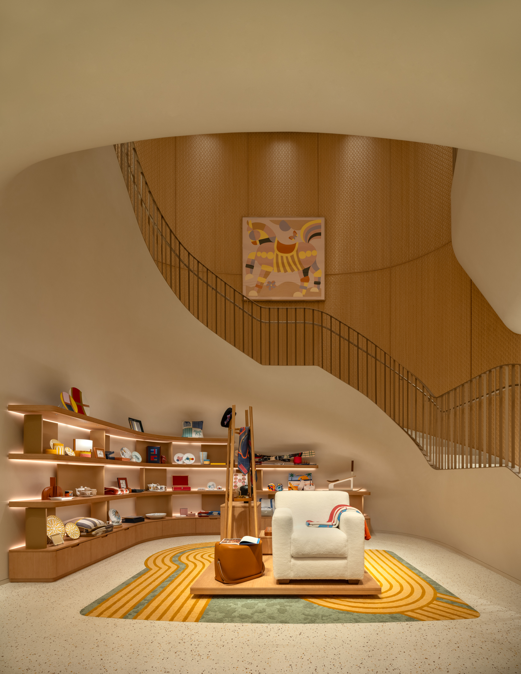 首层笼罩于标志性希腊式琉璃顶灯的柔和光芒之中,顾客可在此领略男士丝织品及马术配件的风采,随后步入家居系列陈列区。左侧空间为男士成衣与鞋履区域,右侧则为包袋与小皮具区。楼梯后方的整面墙壁均覆以柳条编织,营造温馨宜人氛围,致敬源远流长的竹编技艺。