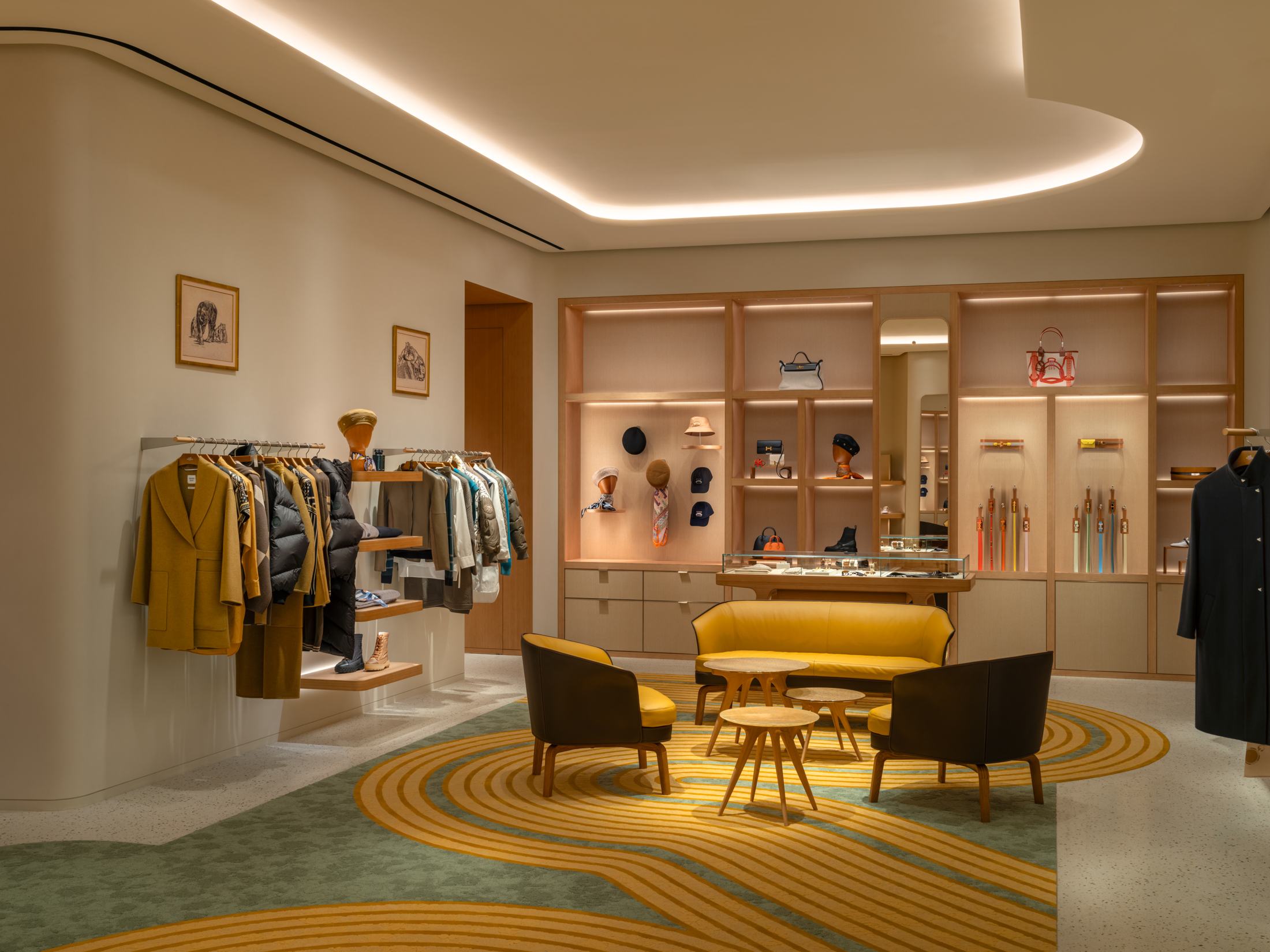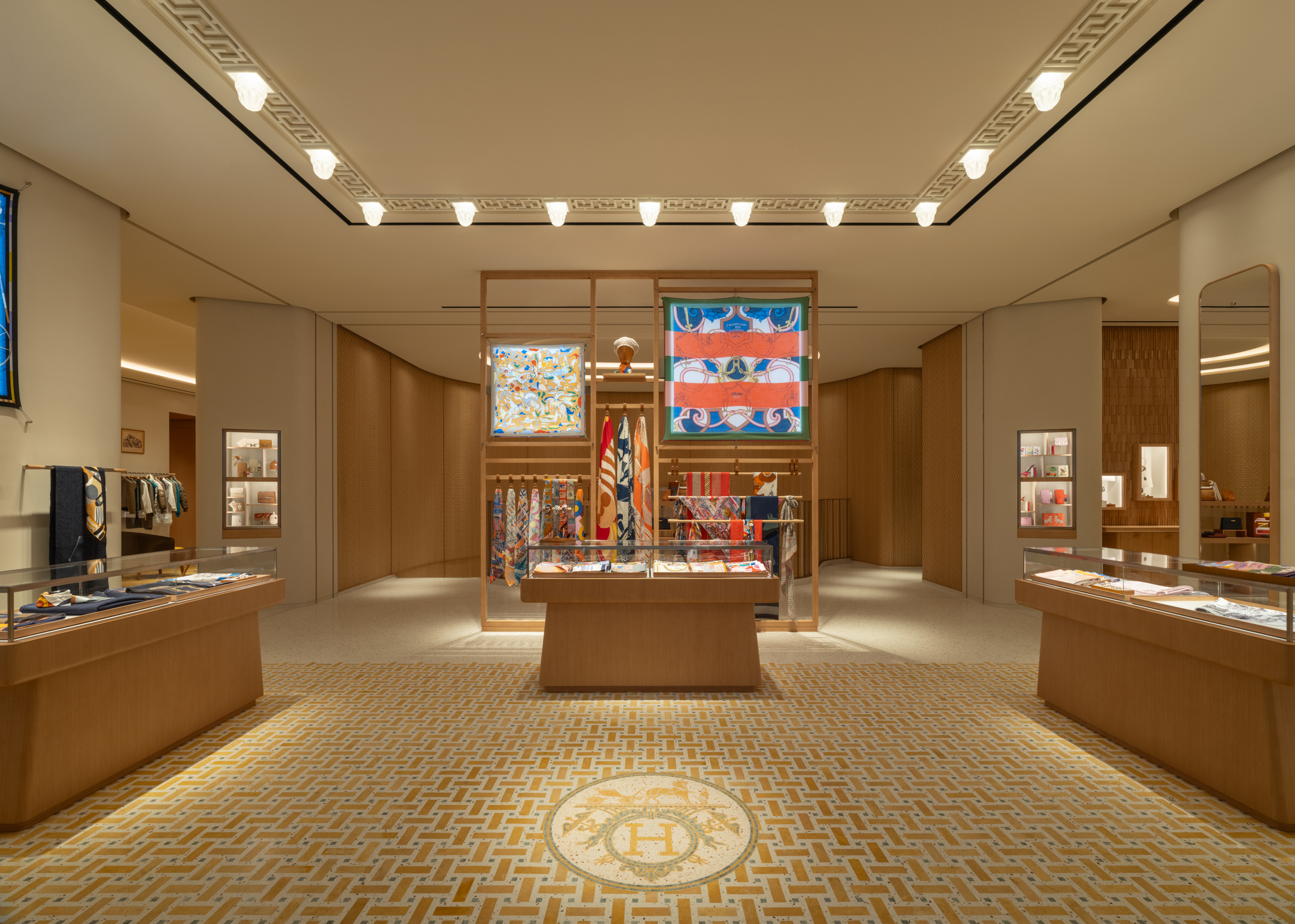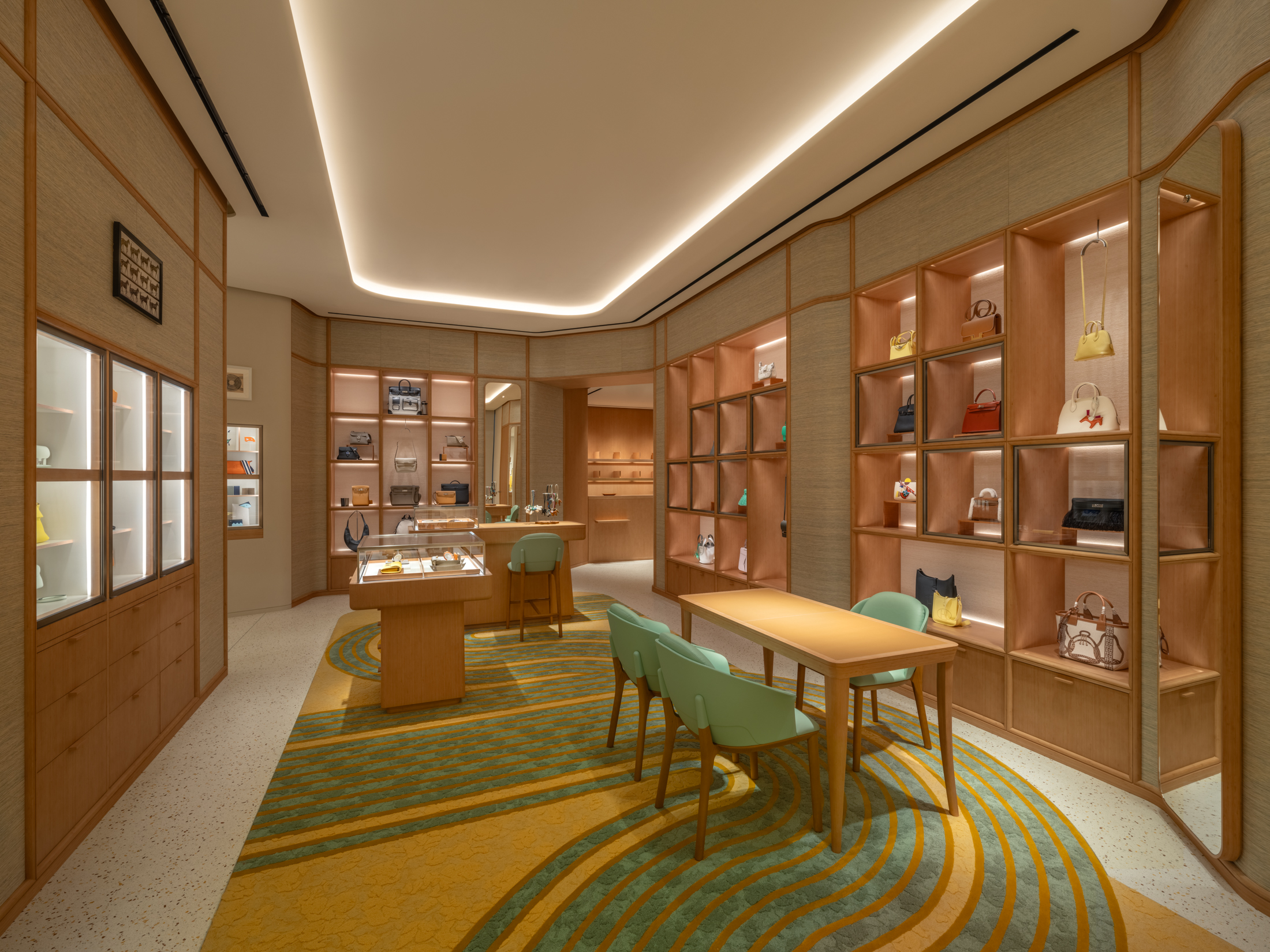 首层笼罩于标志性希腊式琉璃顶灯的柔和光芒之中,顾客可在此领略男士丝织品及马术配件的风采,随后步入家居系列陈列区。左侧空间为男士成衣与鞋履区域,右侧则为包袋与小皮具区。楼梯后方的整面墙壁均覆以柳条编织,营造温馨宜人氛围,致敬源远流长的竹编技艺。