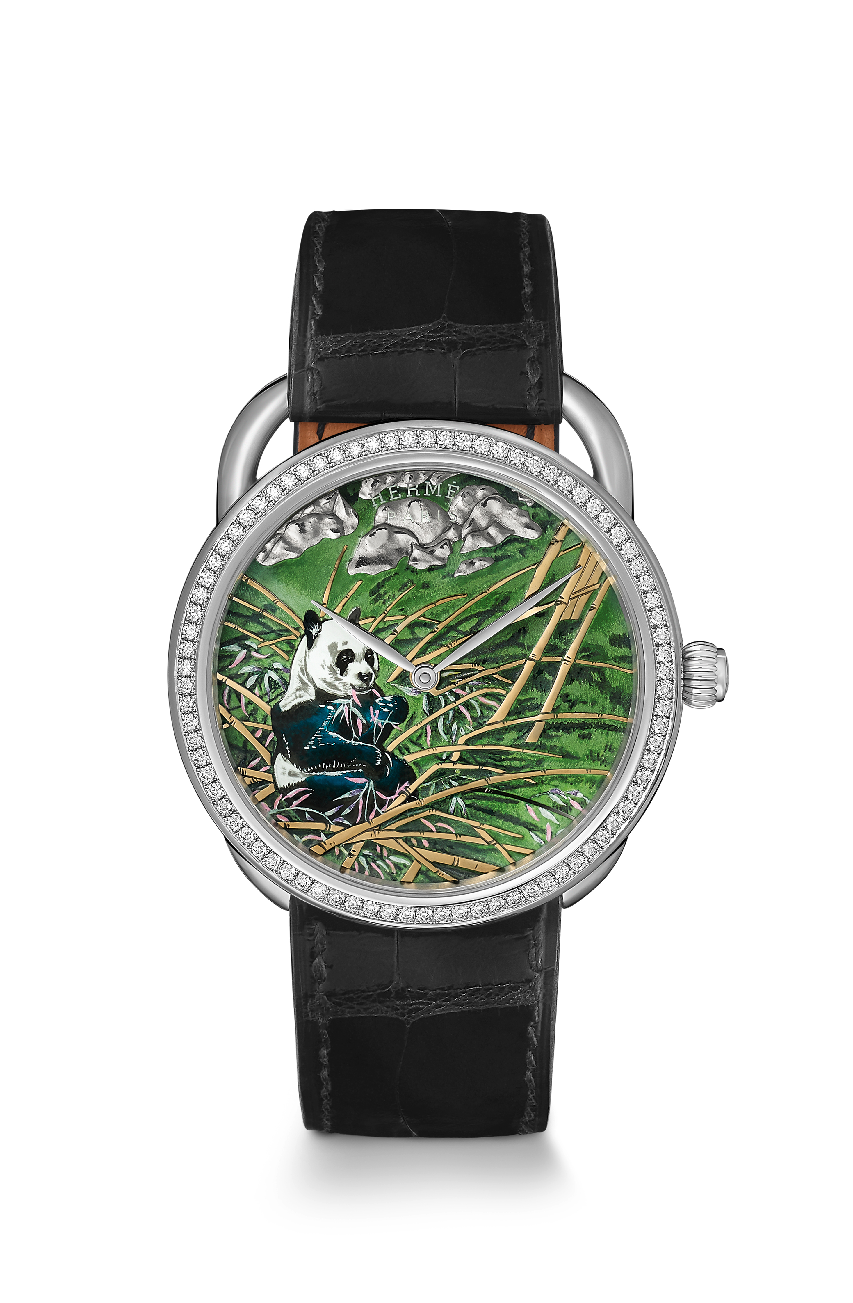 创作灵感源自爱马仕设计工作室1995年推出的Sichuan 方巾,以斑斓色彩与生动图案渲染天府之国的独特魅力。38 毫米的圆形表盘采用微型珐琅彩绘技艺,尽展爱马仕 对于极致工艺的孜孜追求。能工巧匠以一丝不苟的细心和 耐心,赋予憨态可掬的熊猫装饰以丰沛生命力。茂林修竹与青空白云错落点缀其侧,通过鲜明色彩构绘出诗意图景。表圈嵌有共计0.63克拉的82颗钻石,与白金表壳、蓝宝石水晶表镜及抛光黑色表带相映成趣,内部搭载爱马仕自制H1912自动上链机芯,可以提供50小时动力存储,浑然相融精致与智慧,呈现美妙绝伦的时计之艺。