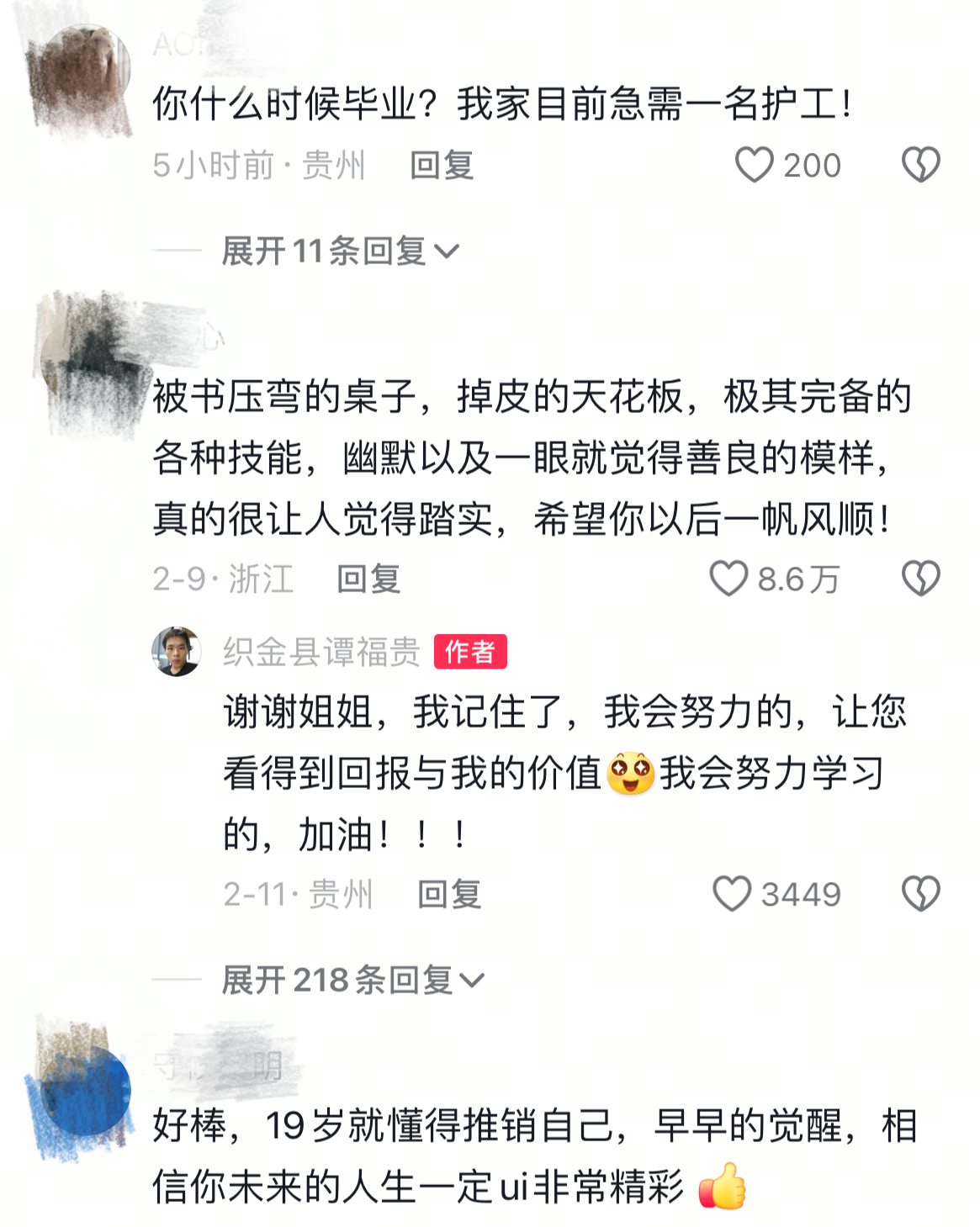 “亲爱的雇主,您好,我叫谭福贵,从小是一名孤儿,由外公外婆抚养长大。发布这条视频是想求职寒假工和暑假工……”近日,贵州省毕节市织金县19岁小伙谭福贵的求职视频引发网友关注。他的成长经历和自立自强的品质,收获了不少称赞,还有不少人向他推介工作,伸出援助之手。