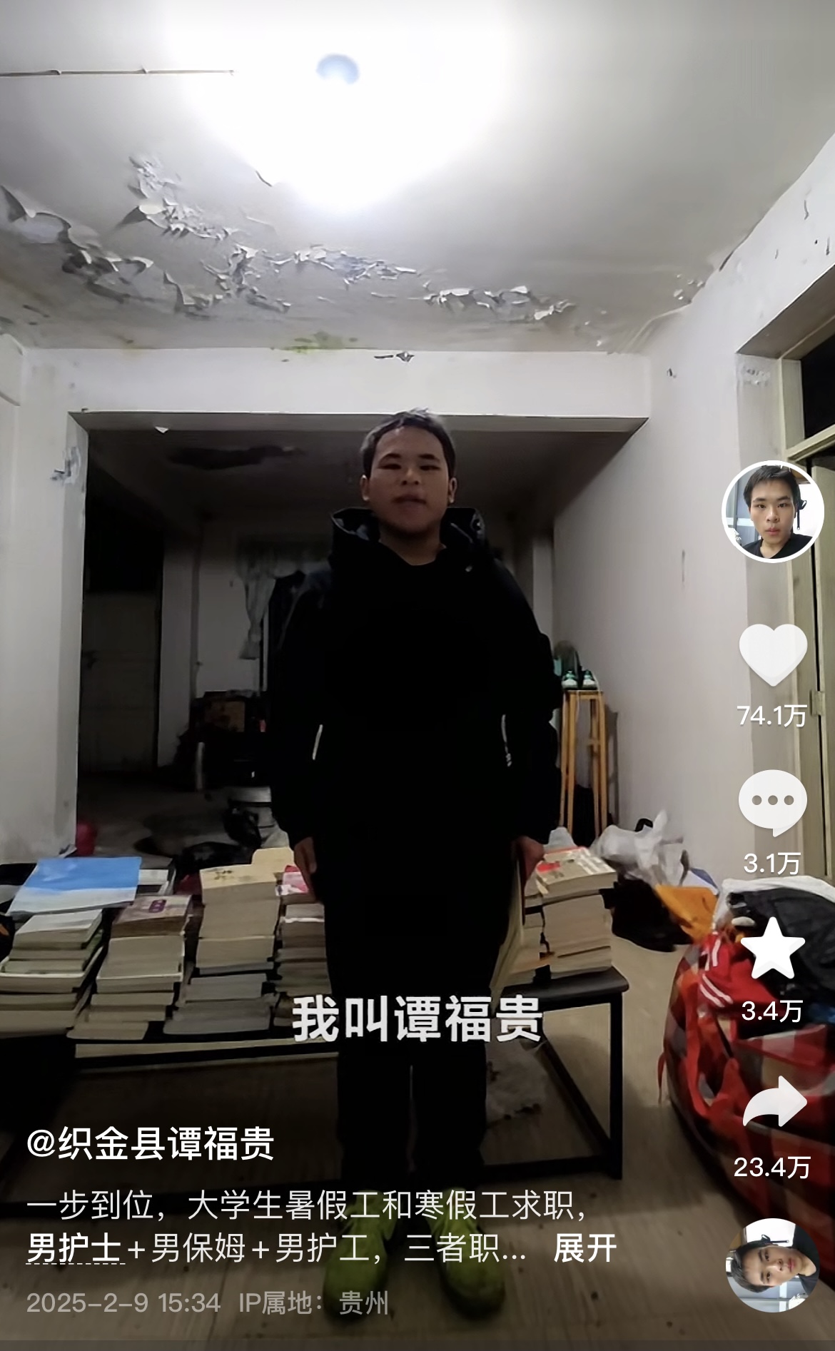 记者看到,谭福贵发的线上求职视频受到不少网民关注,视频点赞数超74万,评论数超3万。视频里,他的背后是被一摞摞书压弯的桌子和掉皮的天花板,他站在镜头前落落大方,详细介绍个人技能和求职优势,“我是一名有职业证书的男护士,除了护理,家政服务我也会,做菜、洗衣、打扫、家电修理我都能做。”
