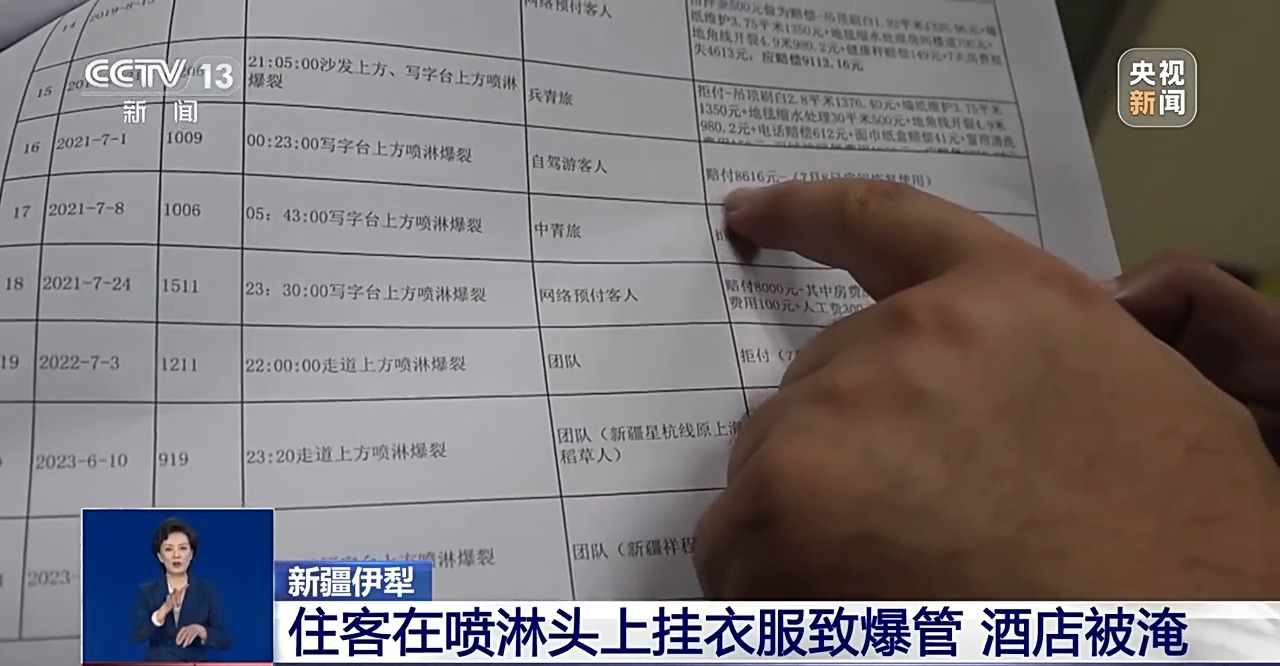 新疆伊犁美景大酒店经理 冯月花:我们的墙纸它会开胶开边,这个床被水浸泡之后,布草基本上就不能用了,然后就是我们这个地毯被泡之后它会缩边,电视机如果进水之后就不能用了。
