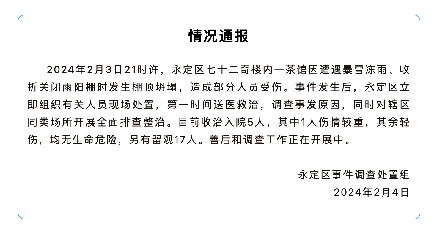 据湖南张家界永定区事故调查处置组2月4日通报,2024年2月3日21时许,永定区七十二奇楼内一茶馆因遭遇暴雪冻雨、收折关闭雨阳棚时发生棚顶坍塌,造成部分人员受伤。事件发生后,永定区立即组织有关人员现场处置,第一时间送医救治,调查事发原因,同时对辖区同类场所开展全面排查整治。目前收治入院5人,其中1人伤情较重,其余轻伤,均无生命危险,另有留观17人。善后和调查工作正在开展中。