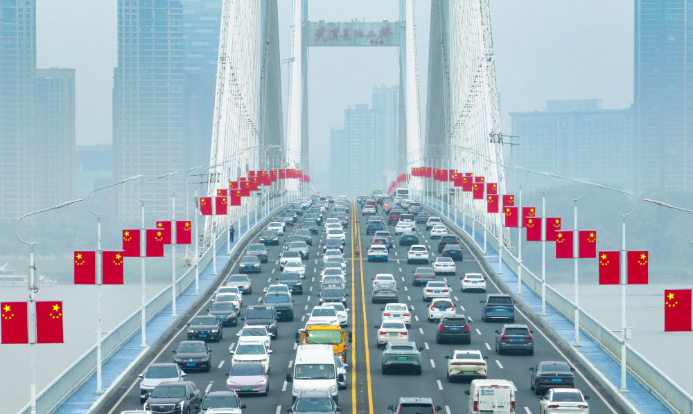 国庆假期第一天,各地迎来出行高峰。这是车辆行驶在湖北省武汉长江二桥上(无人机照片,10月1日摄)。新华社记者 肖艺九 摄