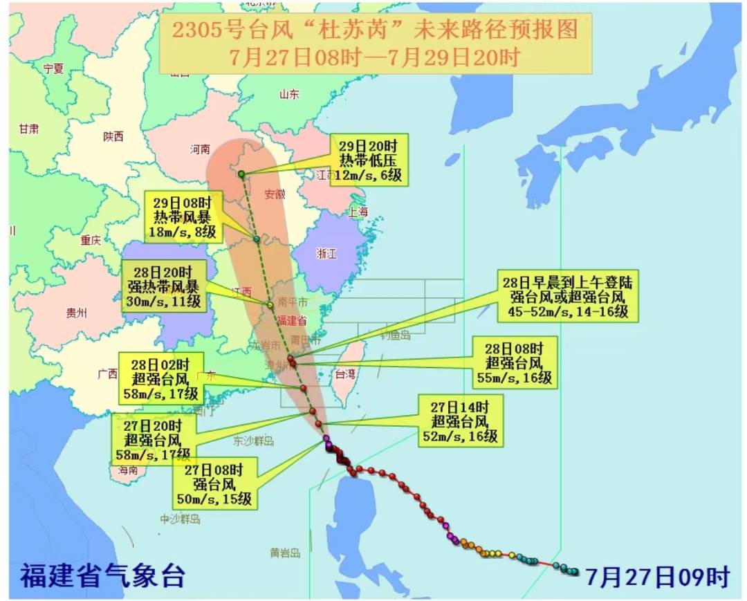 “杜苏芮”今天8时中心位于福建南部沿海东南方向约450公里的海面上(北纬20.5度、东经119.9度),中心附近最大风力15级(50米/秒,强台风级)。预计“杜苏芮”将以每小时15公里左右的速度向西北方向移动,逐渐向我省南部沿海靠近,强度有所增强,最大可能于28日早晨到上午在我省晋江至东山一带沿海登陆,登陆时中心附近最大风力为14~16级(强台风级或超强台风级)。