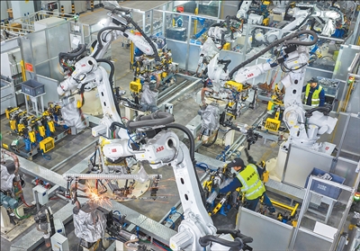 中国是ABB全球最大的机器人交付市场。图为在浙江省湖州市一家新能源汽车部件企业,ABB机器人正在作业。 谭云俸摄(影像中国)