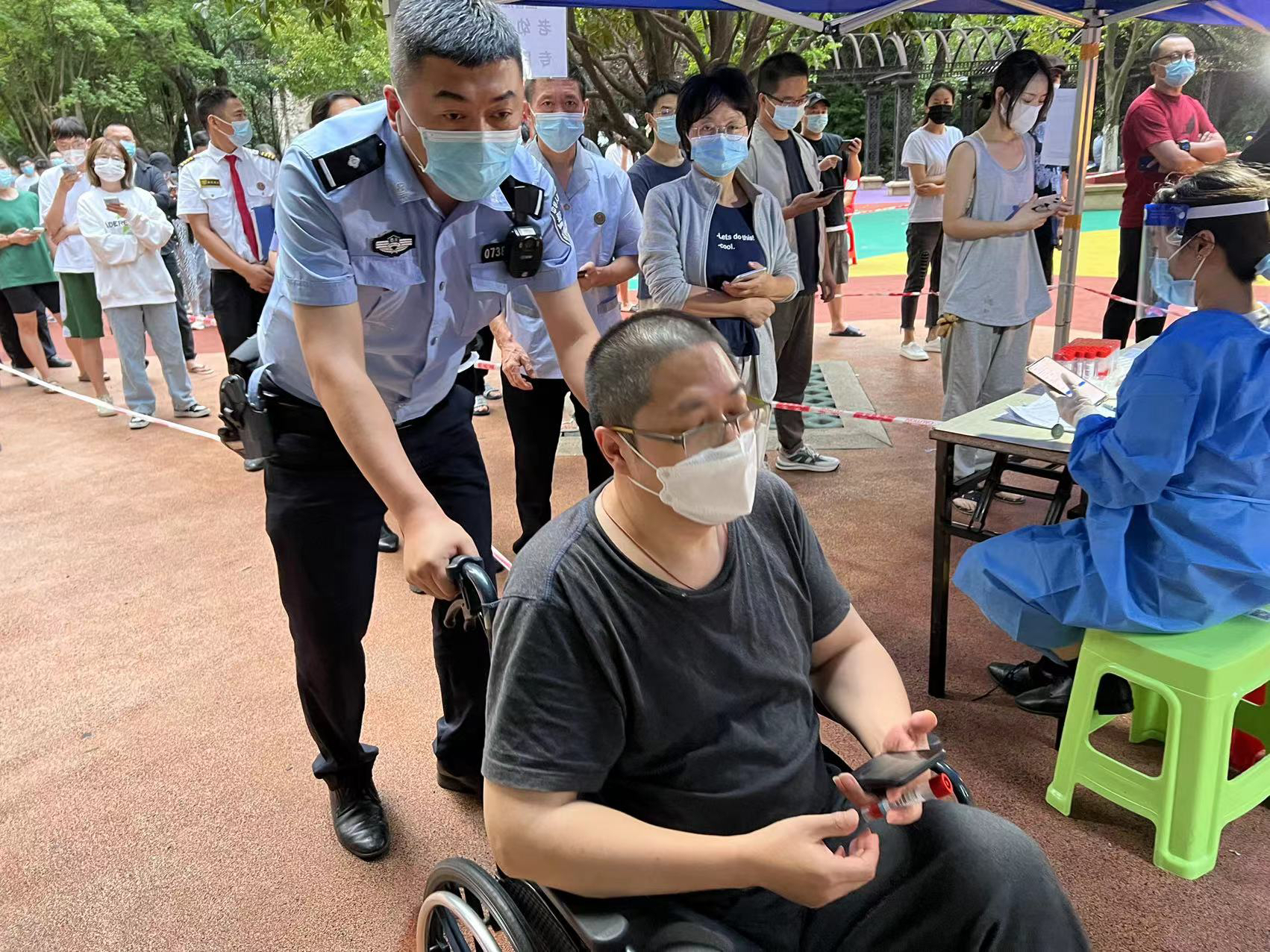 9月4日,在小区开展全员核酸期间,新川派出所点位值守民警陈汝佳观察到了一位坐在轮椅上的残疾人,他正独自一人排队进行核酸检测。陈汝佳看到其行动不便,立即主动上前帮助他——扫码、领管,然后将他小心翼翼地推到医务人员面前,进行核酸检测。对方向陈汝佳连声道谢。