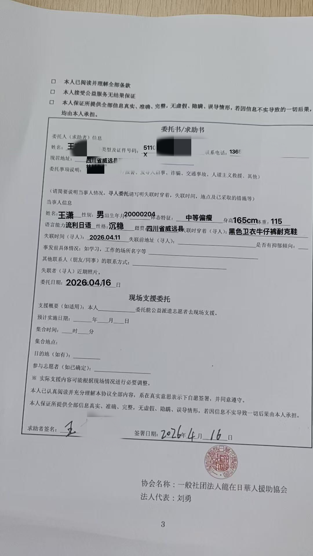 王潇父亲委托日本华人组织帮助寻人